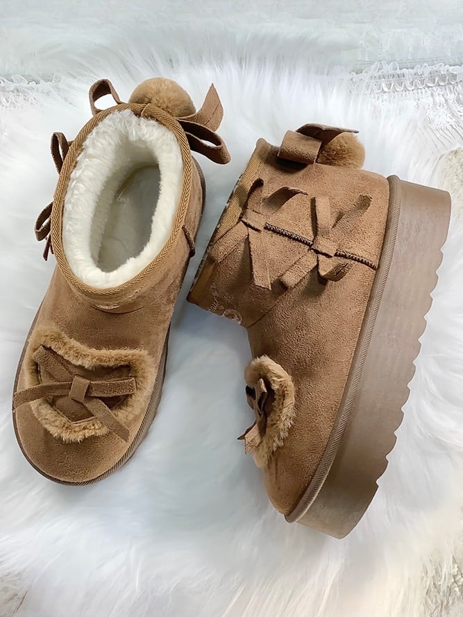 Step into a whimsical wonderland with these brown Sweet Lolita-inspired platform ankle snow boots. Designed to keep you cozy and stylish, these boots feature a charming pompon decoration at the back, adding a playful bounce to every step. Delicate bow details and a heart appliqué bring a touch of romance, while intricate donut embroidery sweetens the look.