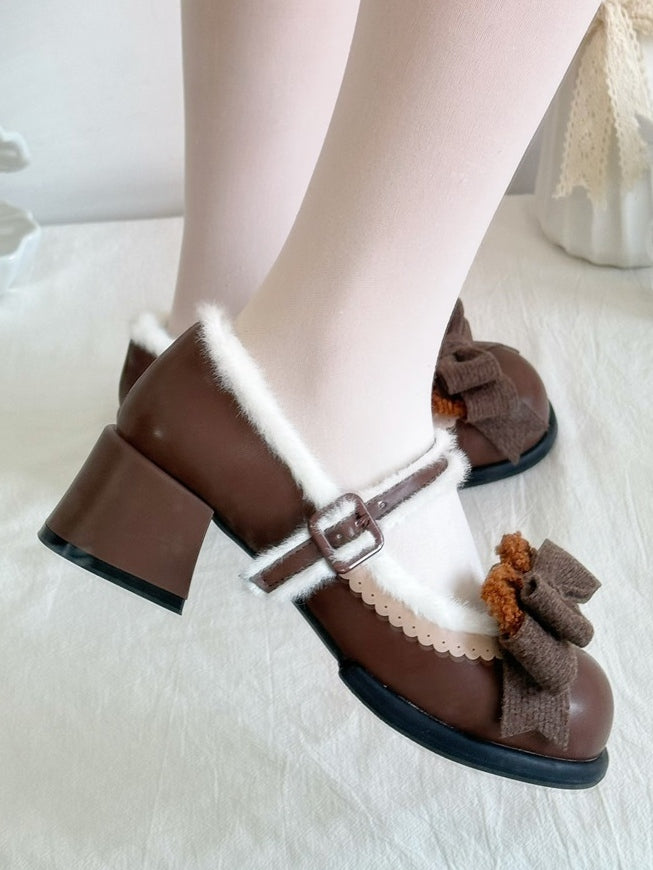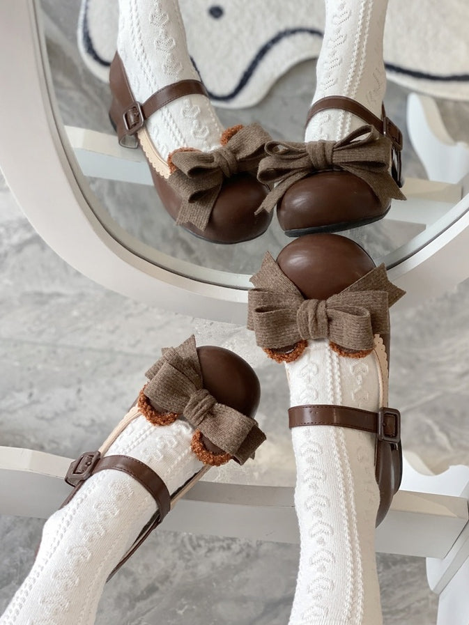 Step into a world of whimsy and charm with these chocolate brown Sweet Lolita style Mary Janes. Featuring a versatile low or mid-heel, these shoes are perfect for both comfort and style. The detachable bear and bow adornments add a playful touch, allowing you to customize your look effortlessly. Designed with a scalloped hem, these Mary Janes exude a delicate elegance that complements any Lolita ensemble.