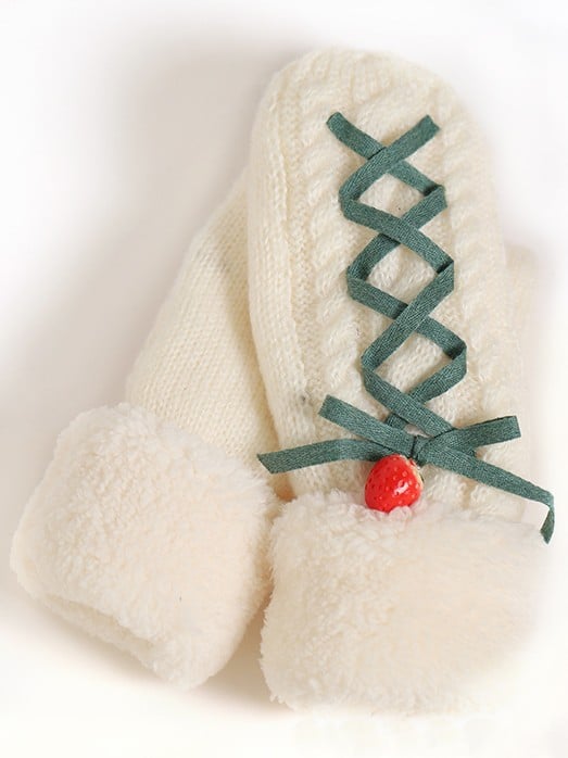 In sweet Lolita style, these knitted gloves feature an off-white base, decorated with green lace-up ribbons and 3D strawberry accents. They are warm and comfortable, adding a pastoral, sweet vibe to looks, suitable for Lolita outfits, daily sweet styles, and autumn-winter warmth matching. The price is for a gloves only. |