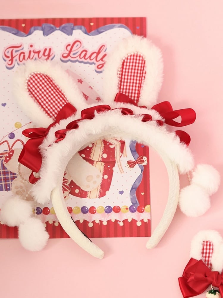 In sweet Lolita style, it integrates plush bunny ears, red & white plaid, red bowknots, and pom-poms. Adding sweet cuteness to looks, suitable for Lolita tea parties and sweet-themed outfits. The price is for a KC. |
