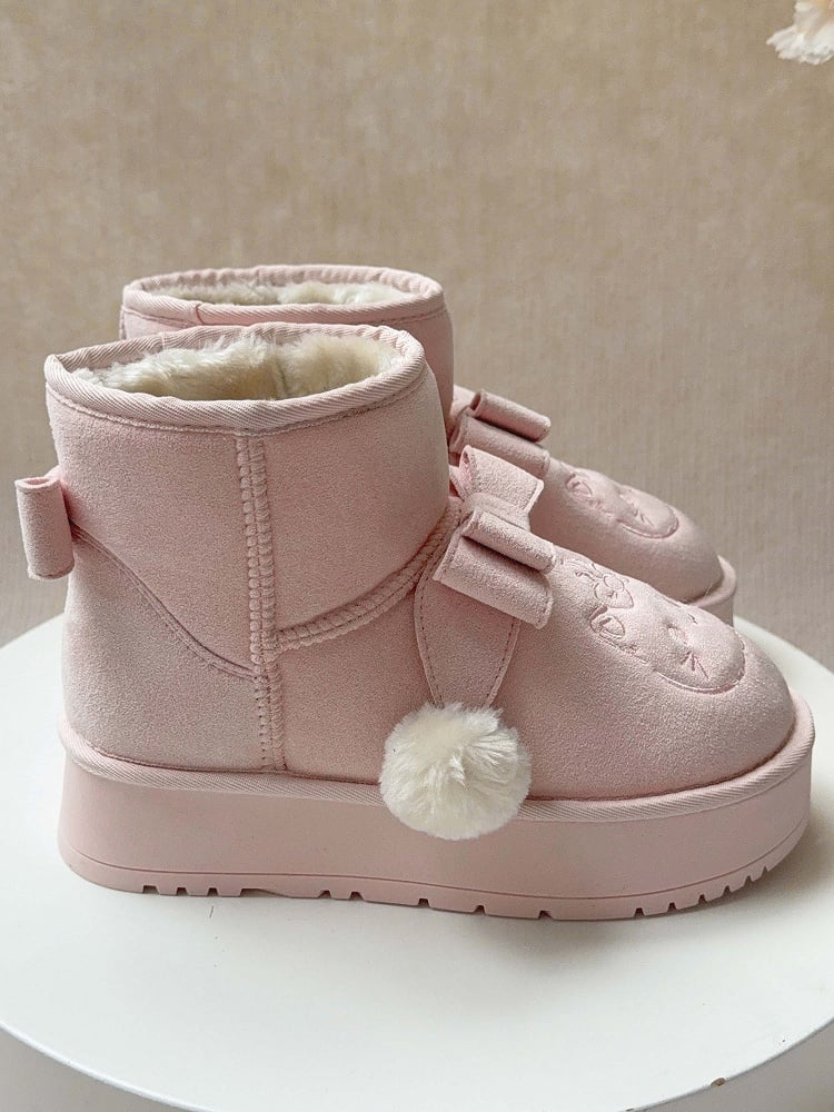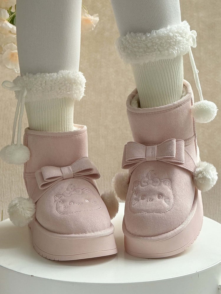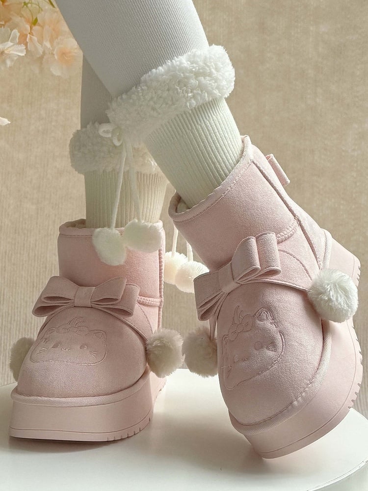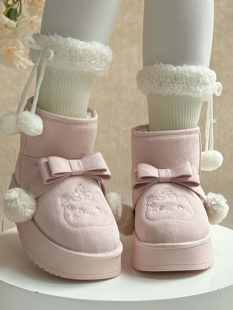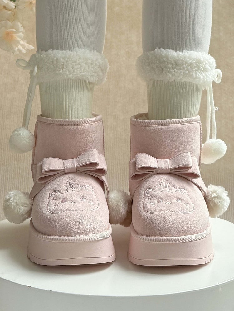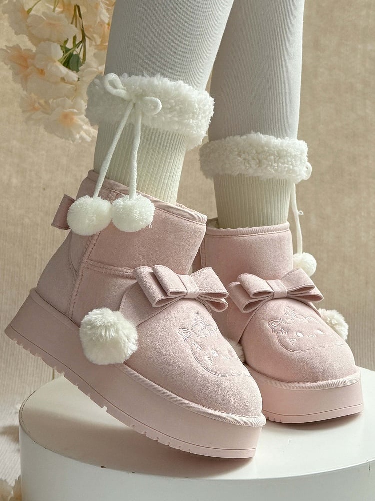Indulge in the whimsical charm of these pink Sweet Lolita platform snow boots, perfect for adding a playful touch to your winter wardrobe. Featuring delightful pom-pom adorned bows and adorable kitten embroidery, these boots capture the essence of Lolita fashion. The plush lining ensures warmth and comfort, while the convenient Slip-In Fit design offers easy wearability.