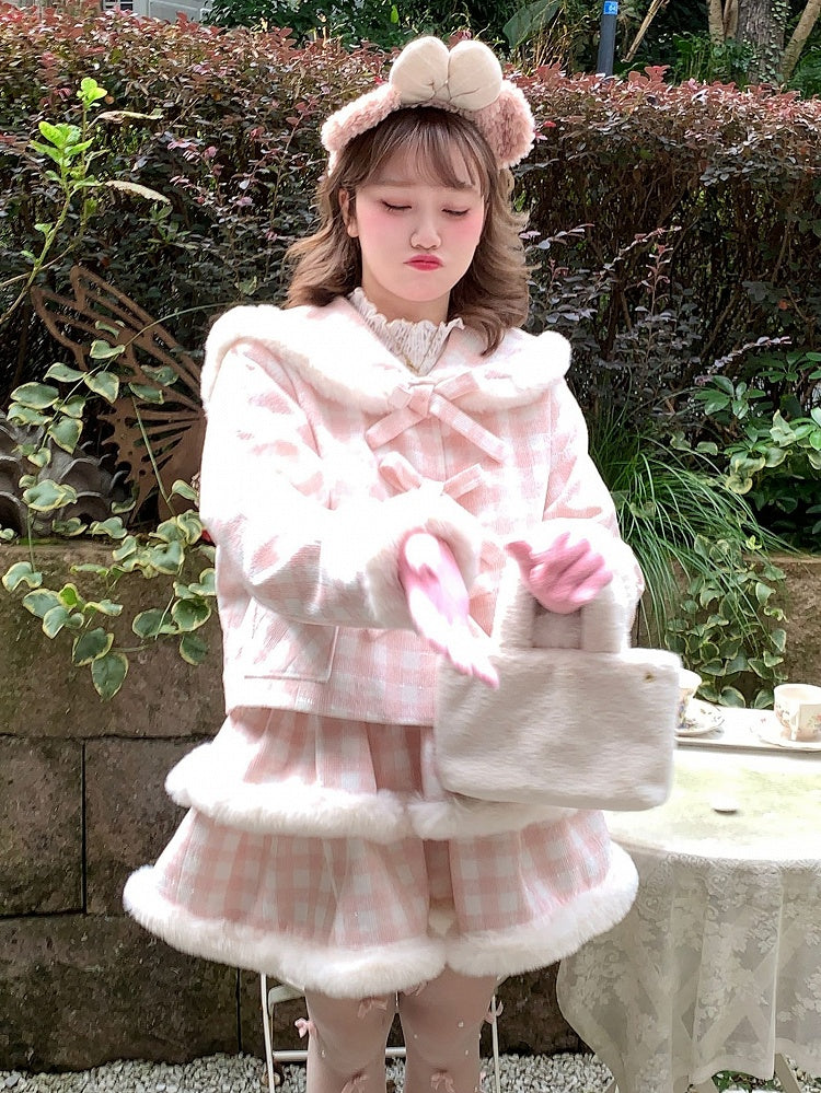 "Embrace the charm of sweet elegance with our Sweet Pink Plaid Tiered Skirt. This delightful piece features a playful plaid pattern in soft pink hues, perfectly complemented by cozy white plush trim that adds a touch of warmth and whimsy. The tiered design offers a flattering silhouette, making it a must-have for any kawaii-inspired wardrobe.