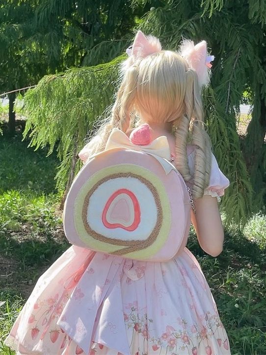 This delightful bag captures the essence of a strawberry cake roll with its charming design and pastel palette. The exterior features a whimsical swirl of colors: a pink outer layer, followed by rings of yellow, brown, white, red, yellow, and pink, mimicking the delectable layers of a cake roll. Adorning the top is a large, eye-catching yellow bow and a playful, upright strawberry, adding a touch of whimsy and charm to your look. Available in two versatile sizes, the large bag transforms into a backpack for hands-free convenience, while the small bag offers a chic crossbody option. Two size bags all have adjustable pink strap.