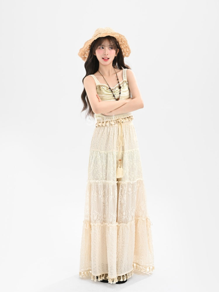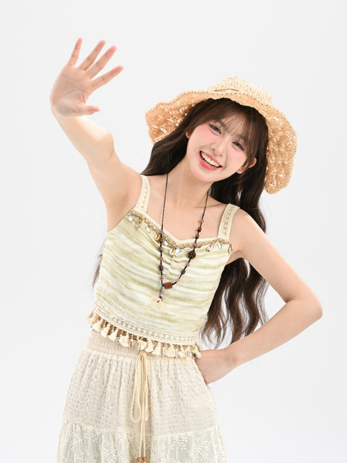 Dive into a world of whimsical charm with this green spaghetti strap top. The delicate fringe edges add a playful touch, while the enchanting shell charm brings a hint of seaside allure. Perfect for those who adore a blend of lolita and kawaii aesthetics, this top is a must-have for creating dreamy, ocean-inspired looks.