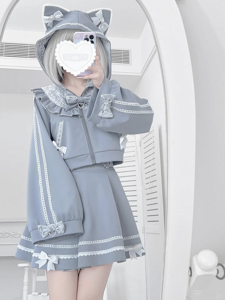 Embrace the edgy charm of Jirai Kei fashion with our Light Blue Cat Ear Hooded Zip-Up Jacket and Matching Skirt Set. This unique ensemble combines playful and mysterious elements, making it a standout addition to your wardrobe. The jacket features adorable cat ears on the hood, adding a whimsical touch to your look, while the white lace trim enhances its femininity. The matching skirt complements the jacket perfectly, offering a cohesive and stylish outfit.