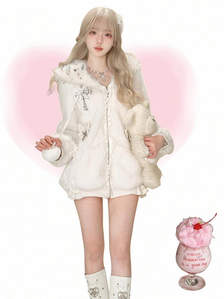 This delightful plush jacket perfectly blends comfort with cute aesthetics, making it an essential piece for your daily kawaii wardrobe. The hood features charming cat ear accents, adding a playful touch to your look. Intricate lace trim enhances its femininity, while cross details introduce a subtle edge. Adorable bow embellishments and a playful pompon charm complete this jacket, making it a standout piece for any casual outing.