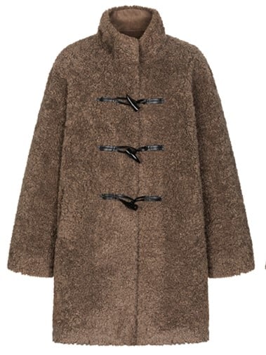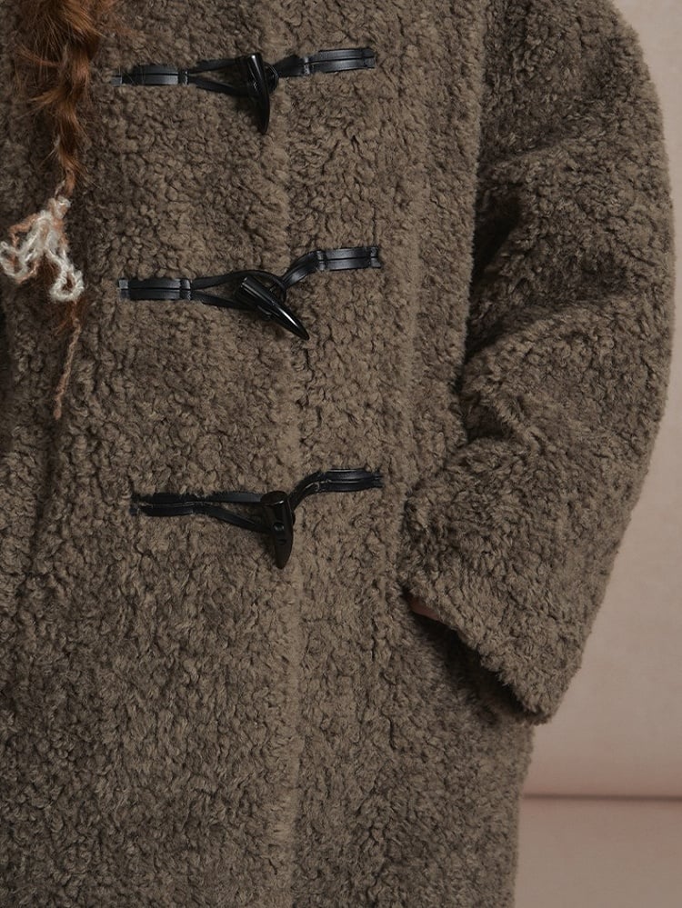 This dark gray plush coat combines classic toggle closures with a straight-cut silhouette for versatile sophistication. Featuring a stand collar and hand-stitched details, it offers wind protection and insulation with a relaxed fit. The deep gray hue and collegiate style make it an effortlessly chic staple for autumn and winter.
