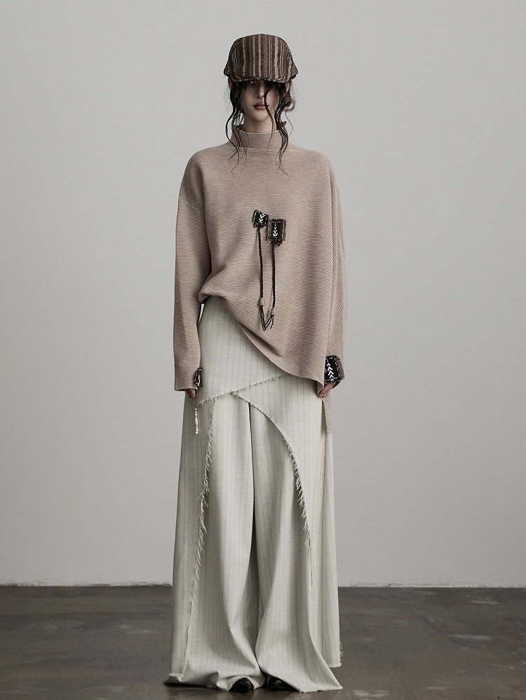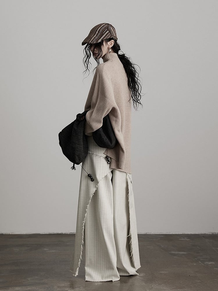 This wide-leg pants highlights apricot pinstripe fabric + asymmetrical cut + frayed details: The light apricot stripes fit the cool texture of dark style, and the asymmetrical layered cut enhances avant-garde styling; Frayed edges and side bead accents add retro details to the silhouette, while the loose, flowing shape balances relaxation and sleekness—it’s a signature light goth piece of "avant-garde cut + dark soft vibe".