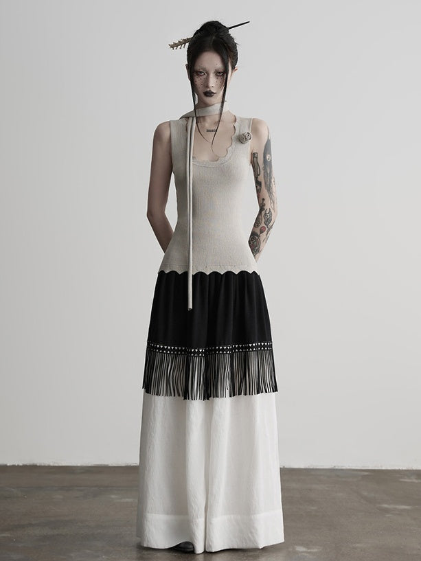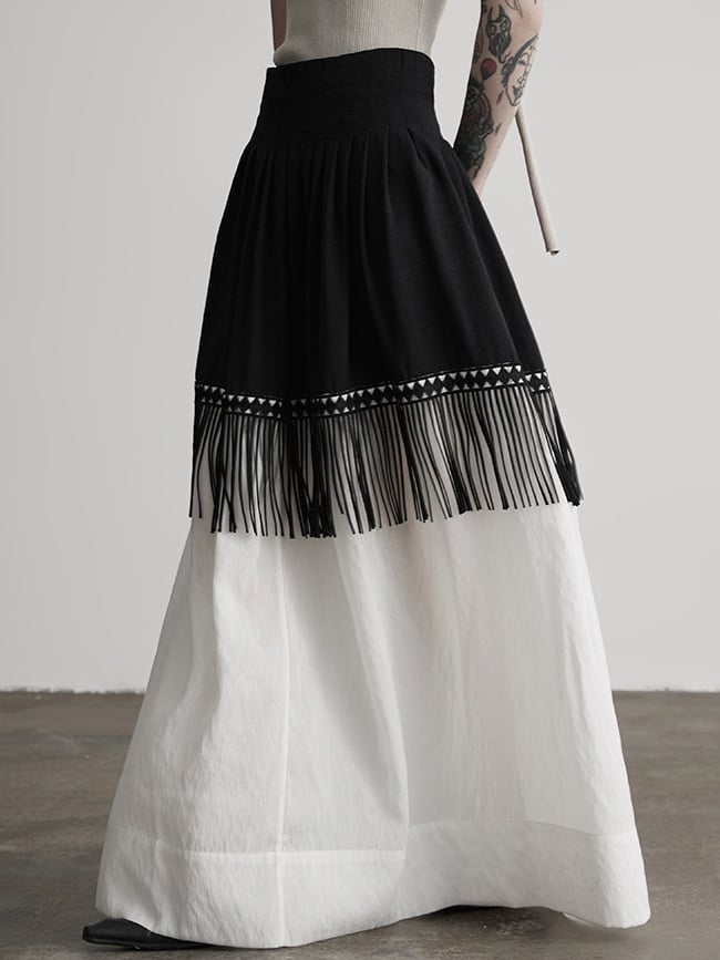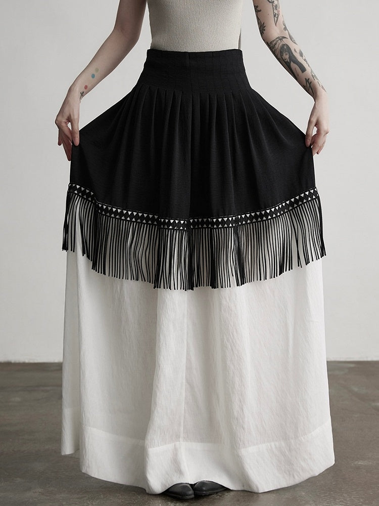 This Urban Goth-style black and white patchwork A-line maxi skirt features black-top-white-bottom color blocking that breaks monotony and fits gothic dark-toned aesthetics; the geometric pattern trim at the patchwork part is paired with matching tassels, which sway with movement to add vivid layers. The loose A-line silhouette flatters all body types, modifies leg lines while exuding a casual aura.
