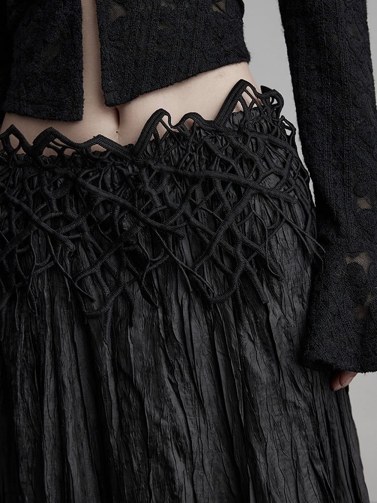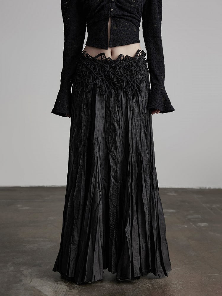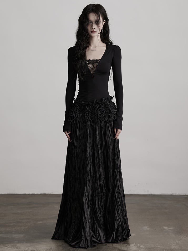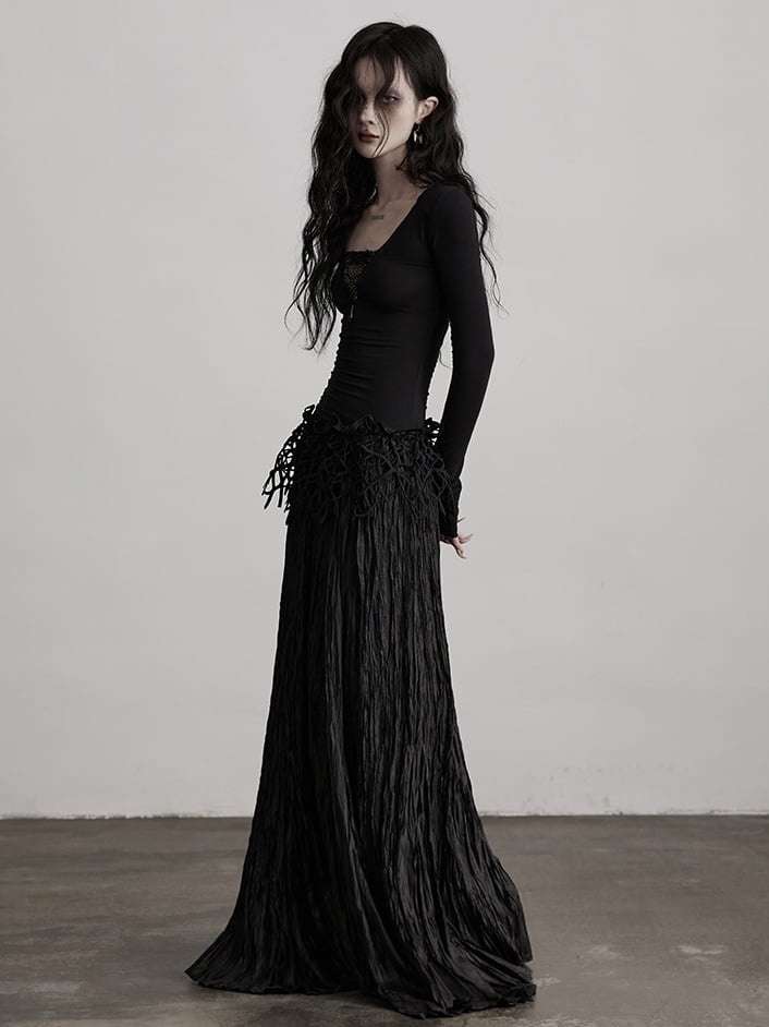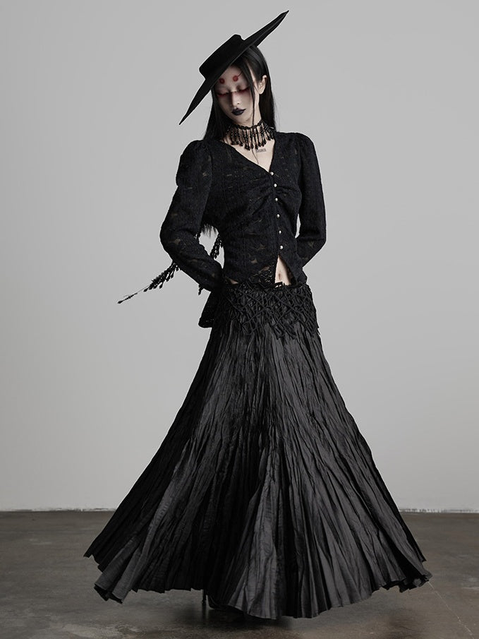This Urban Goth-style black long skirt features pleated craftsmanship to create a smooth straight A-line silhouette, with the naturally flowing hem exuding dark elegance. The waist root decor is the design highlight—its 3D texture echoes gothic decadent aesthetics, adding detailed tension to the solid black base.The long length suits light gothic daily wear and niche gatherings; pairing it with a slim cropped top enhances the figure proportion, making it a core urban goth piece that balances texture and style.