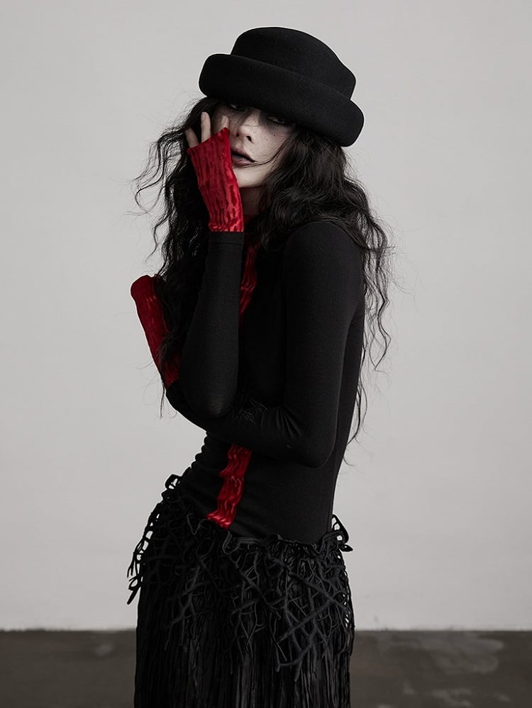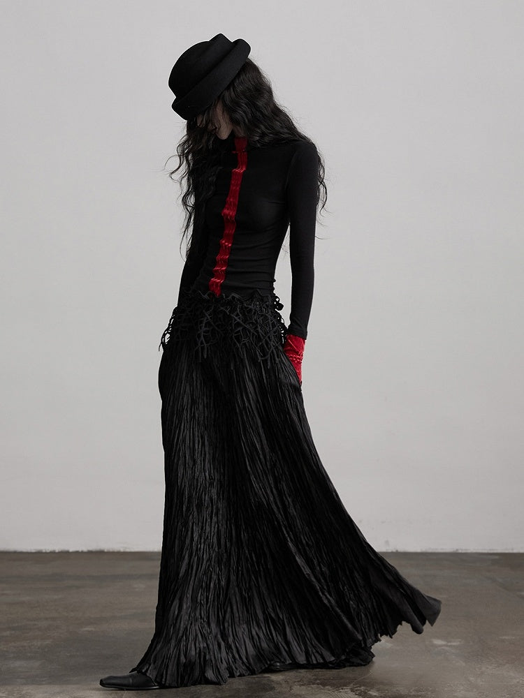 This Urban Goth-style knit top takes black & red contrast color-block as the core design: the main body uses an all-black base, with a slim fit that hugs the body and inherent neat coolness; the center line and cuffs are vertically spliced with rich red—the strong color contrast not only breaks the monotony of pure black, but also precisely fits the tension tone of dark style.