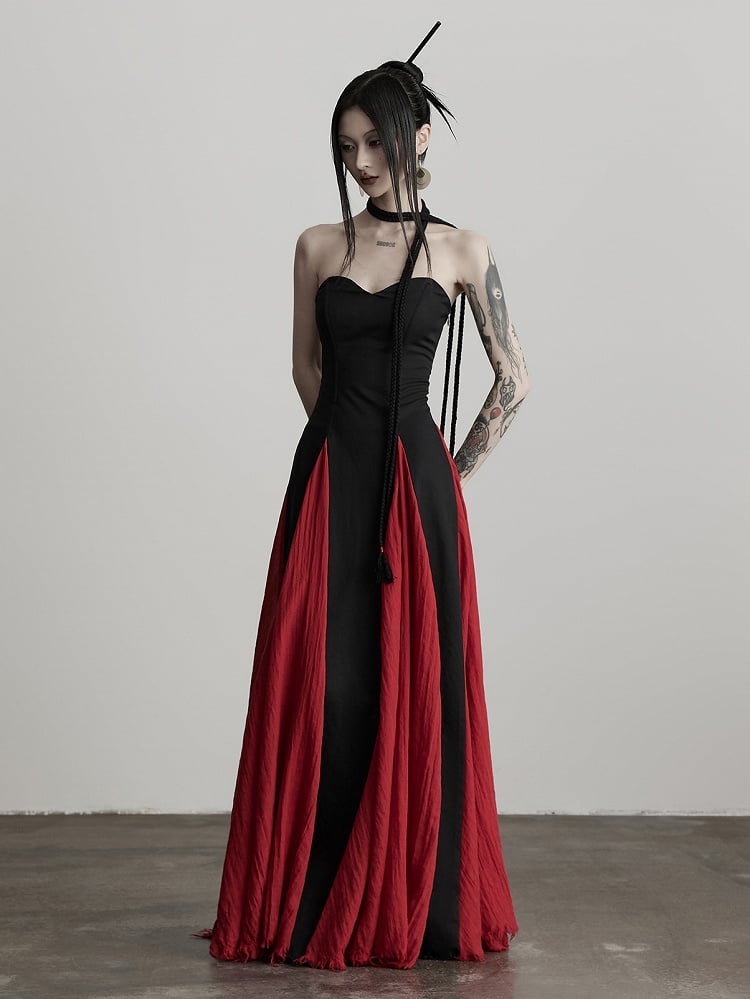 This camisole dress highlights black & red color-block + fringe straps + frayed hem: The black-red color contrast fits gothic dark retro tension, and the camisole silhouette defines sleek shoulder and neck lines; The adjustable multi-fringe straps allow free styling, while the frayed hem enhances avant-garde texture—it’s a signature light goth piece of "color-block layers + dark avant-garde style".