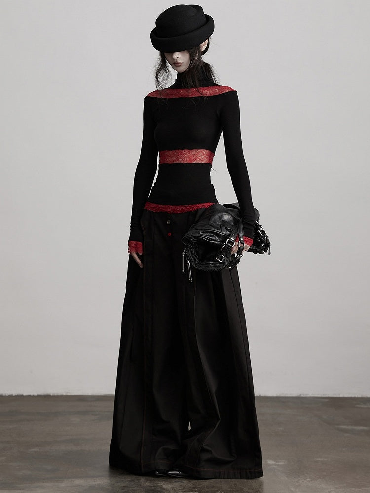 This Urban Goth top highlights black & red paneling + slim-fit knit + turtleneck silhouette: The black-red base fits gothic dark tones, while color-blocked paneling boosts visual layers; The slim-fit knit outlines sharp lines, and the turtleneck + long-sleeve design suits layering—making it a signature light goth piece of "color-block contrast + dark sharpness".