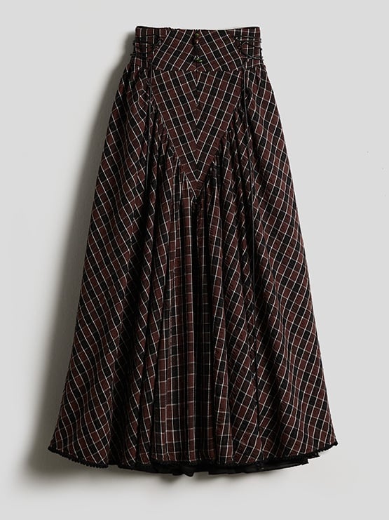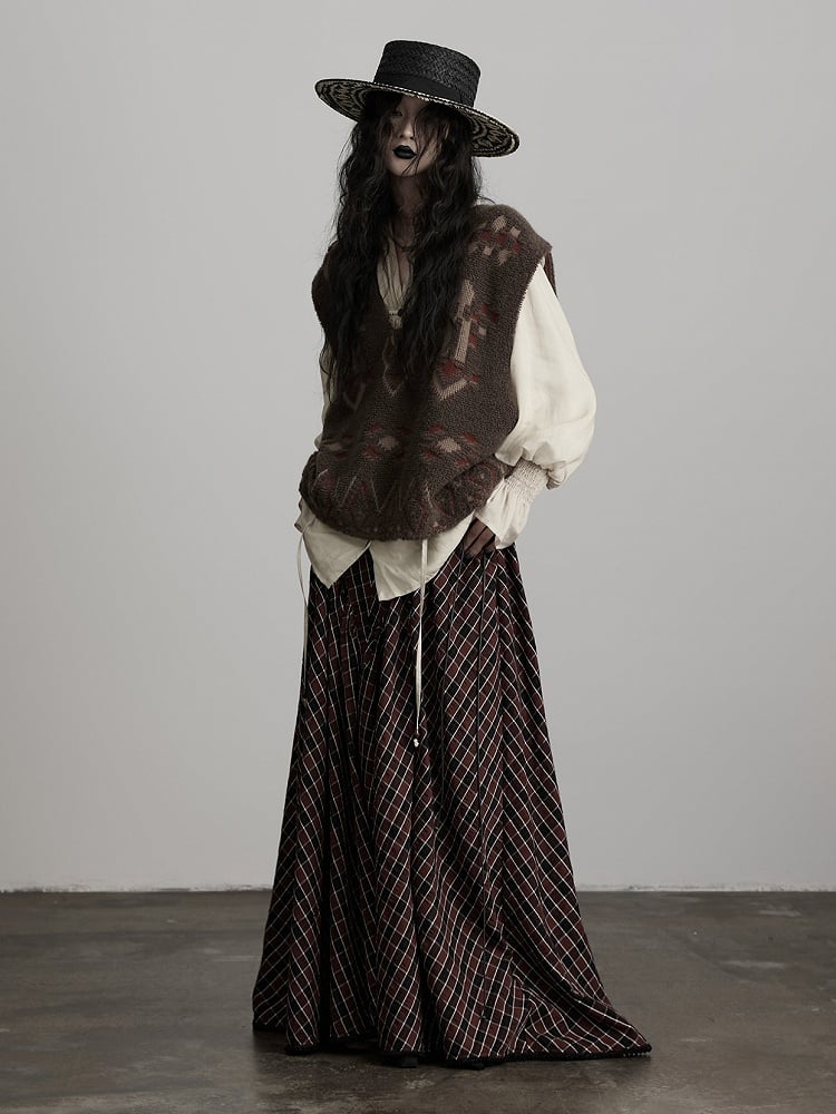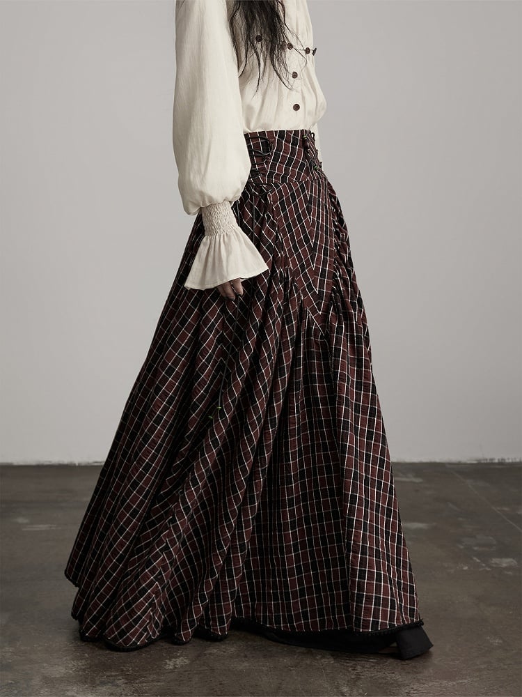 This A-line skirt highlights black retro tartan fabric + lace-up detail: The black-toned tartan fits the gothic dark retro vibe, and the lace-up detail adds textural touches to the skirt; The neat A-line silhouette enhances body proportion, while the relaxed skirt balances styling appeal and comfort—it’s a practical light goth piece of "retro tartan + dark detailed vibe".