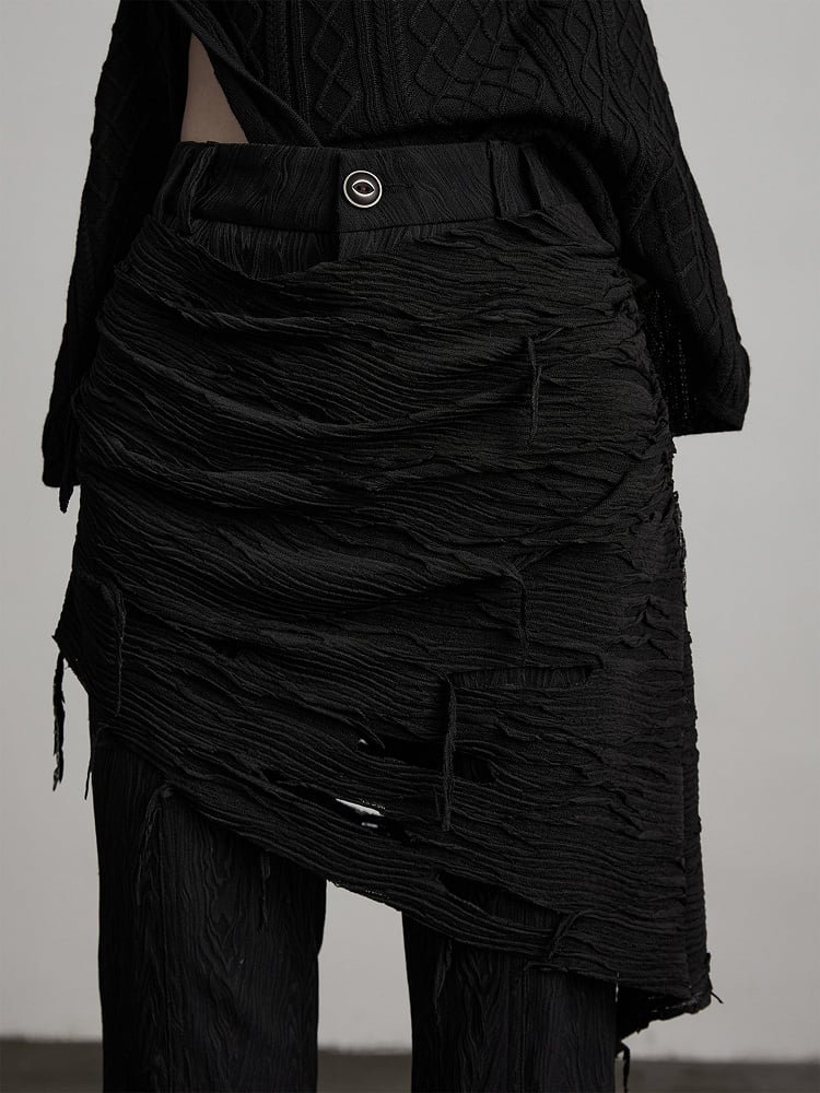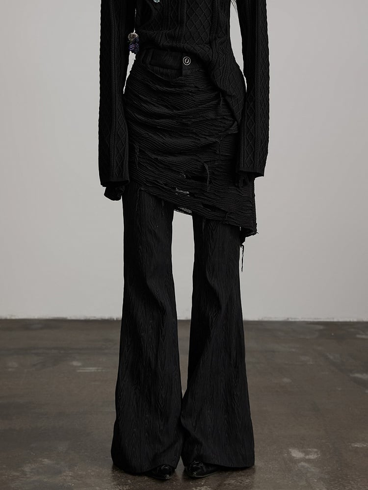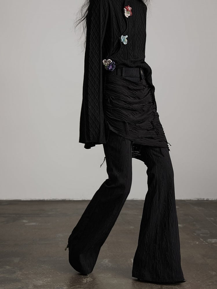 This Urban Goth set features a ruched patterns flared pant + distressed skirted waist cincher core combination: the black fabric’s ruched texture carries the decadent vibe of dark style, and the flared silhouette enhances casual tension; the matching skirted waist cincher has distressed details—its torn accents amplify the style’s avant-garde deconstructed feel. The waist cincher’s skirt shape layered over pants not only defines the waist but also creates Urban Goth’s iconic dark-edgy atmosphere through textural contrast, making it a coordinated piece that blends tactile details and styling impact in light gothic outfits.