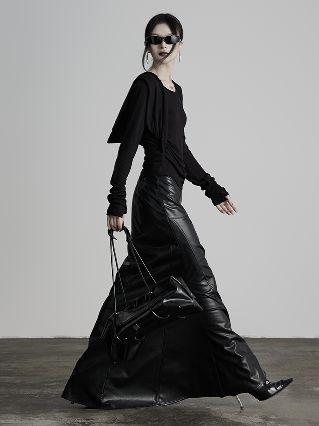 This Urban Goth-style black leather skirt features a matte leather fabric to create a slim-fit + large hem silhouette, hugging the body while exuding a cool aura; the core design includes split + rivet decor, paired with waist-side buckle decor to further boost the detailed tension of the look. The hem drapes naturally when moving, and the split design adds casualness.