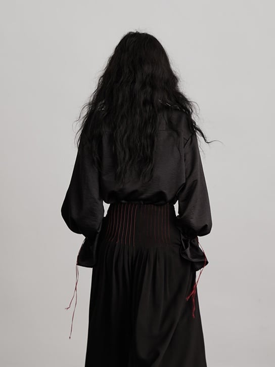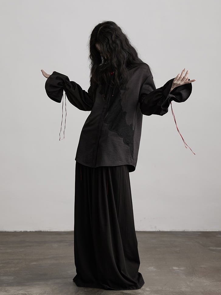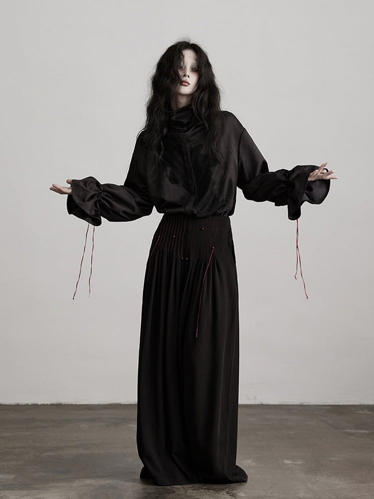 This shirt highlights black subtle pattern textured fabric + drawstring adjustment design + red button brooch: The solid black base fits the gothic dark tone, and the subtle pattern texture has an understated finish; The drawstring details flexibly adjust the silhouette’s relaxation, and the red button brooch acts as a color-clash accent that adds avant-garde visual focus to the dark vibe; The loose sleeves balance comfort and styling appeal—it’s a signature light goth piece of "dark texture + detailed ingenuity".