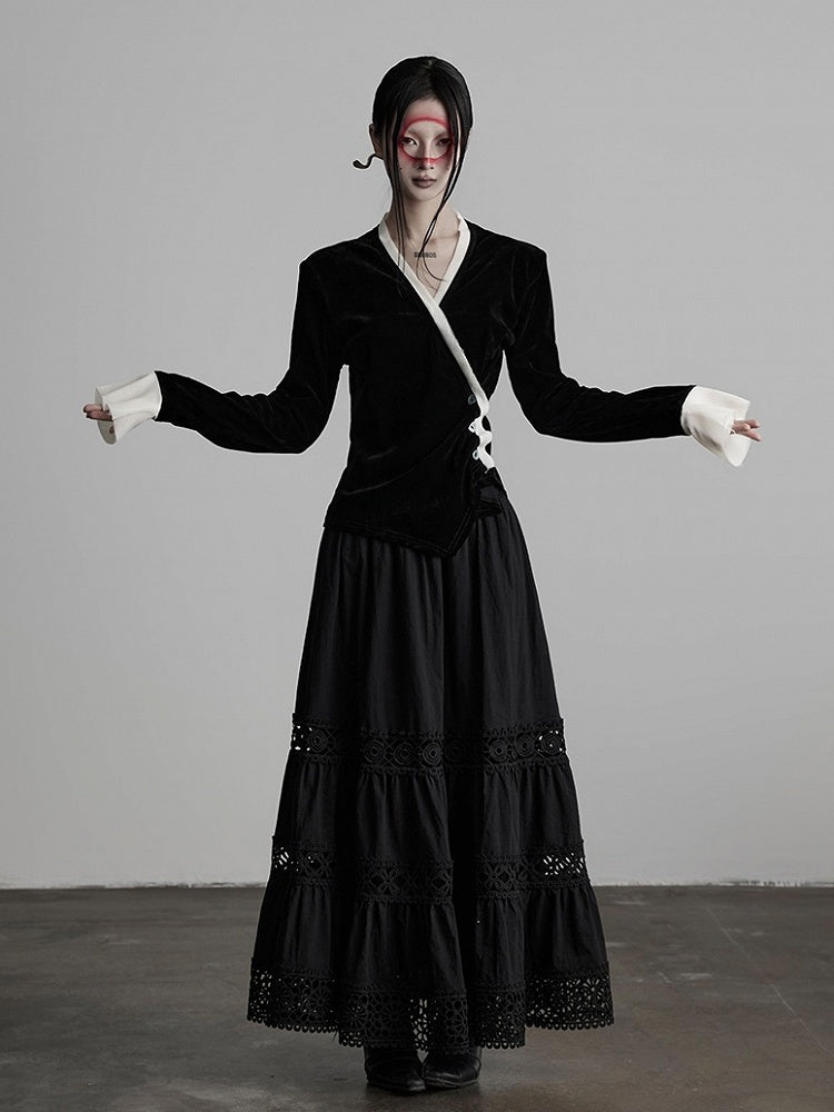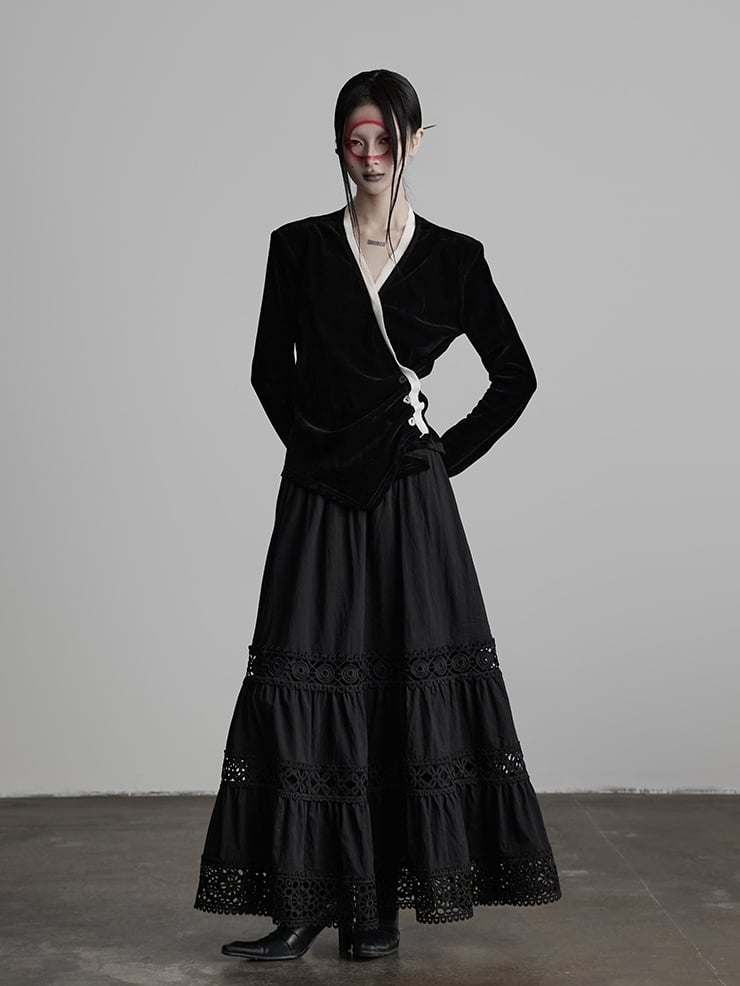 This Urban Goth-style cardigan takes black & white color-block + asymmetrical-button V-neck as the core design: the main body is made of black velvet fabric, with inherent retro luxurious texture of dark style; the V-neck edge and cuffs are spliced with white fabric, paired with elegant sleeves—it not only breaks the monotony of pure black through color contrast, but also adds retro layers with the sleeve shape; the asymmetrical button arrangement enhances the deconstructive sense, and the body-fitting silhouette balances relaxation and neatness.