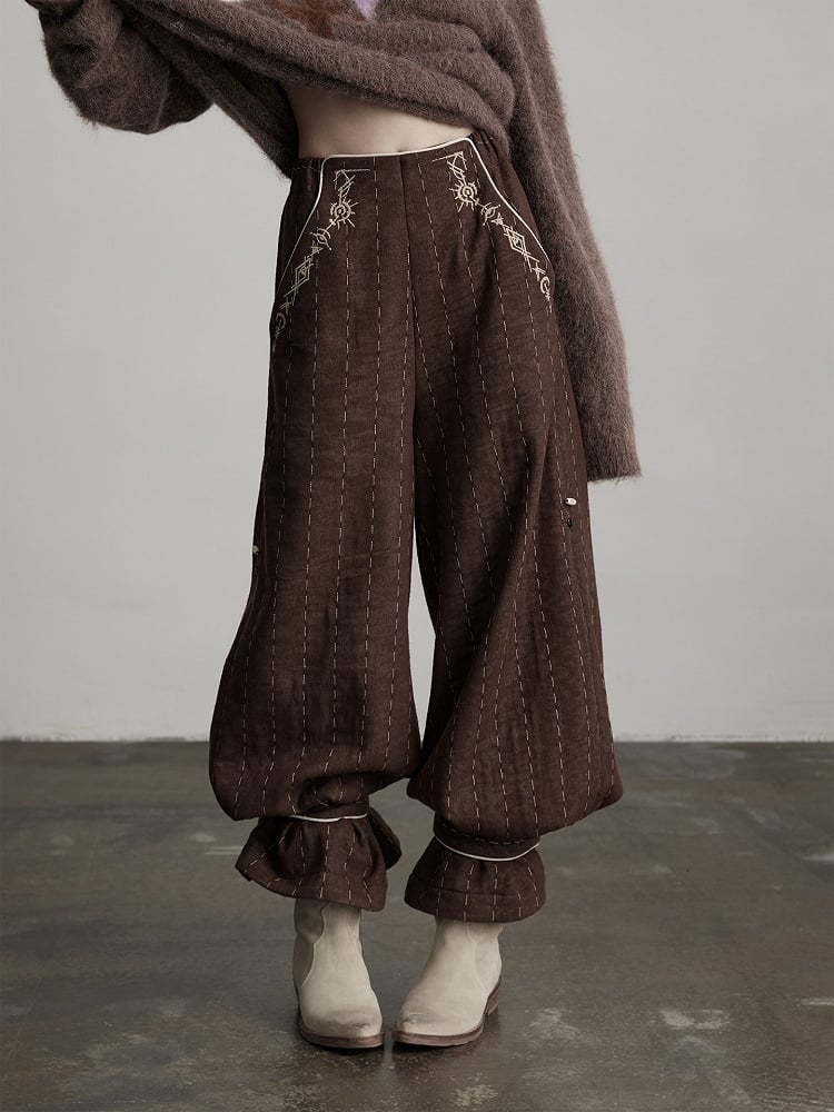 This wide-leg pants highlights dark coffee thick fabric + embroidered stripes + leg-cuff design: The dark coffee thick material meets the texture needs of gothic autumn-winter outfits, fine stripes and delicate embroidery blend retro details; The loose wide-leg silhouette balances relaxation and warmth, while the leg-cuff design flexibly switches styling styles—it’s a signature light goth autumn-winter piece of "retro texture + practical styling ingenuity".