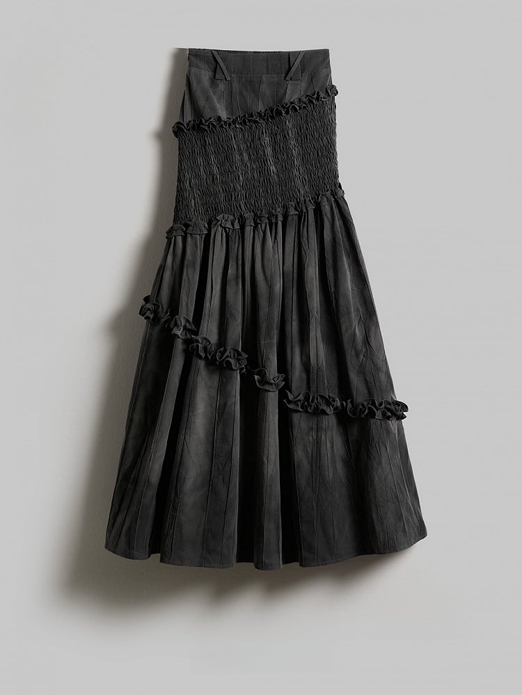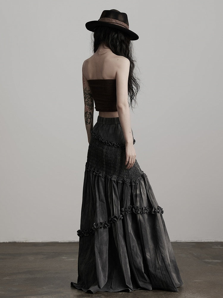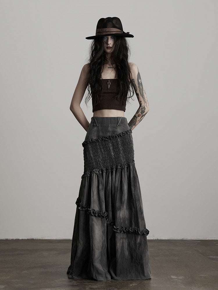 This Urban Goth mermaid skirt highlights dark grey tie-dye + ruched texture + ruffle details: The dark grey tie-dye fabric has a vintage, decadent dark vibe, with a low-saturation tone fitting gothic coolness; Waist-hip ruching boosts silhouette tension, while irregular ruffles balance softness and avant-garde deconstruction; The mermaid hem adds dynamic drape, and the maxi silhouette blends styling and atmosphere—making it a signature light goth piece of "soft elements + dark texture".