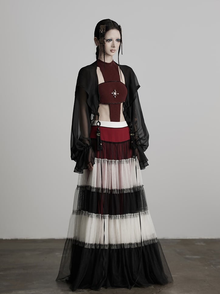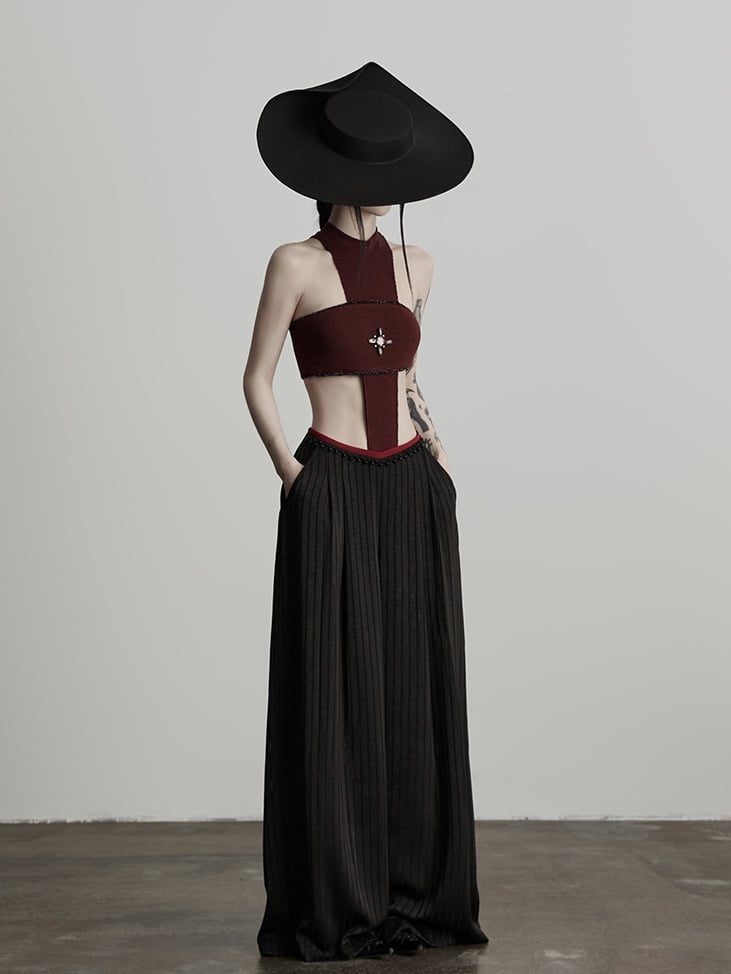 This Urban Goth top highlights dark red base + cross design + cutout shoulder silhouette: The dark red fabric fits gothic dark tones, while the cutout shoulder design adds sensual tension; The chest cross design is the style core, boosting gothic recognition; The halter-neck, cutout shoulder cut suits layering or solo wear—making it a signature light goth piece of "religious elements + dark sensuality".