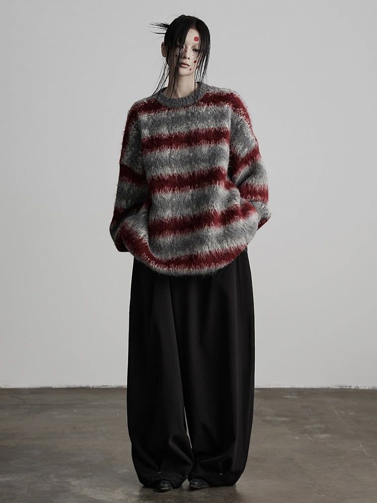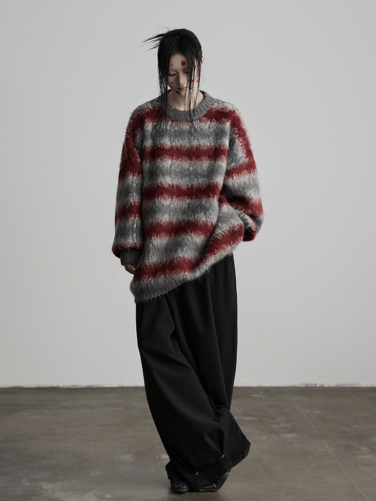 This Urban Goth sweater features grey & red contrast stripes + fuzzy texture + oversized silhouette as core highlights: the contrast stripes of grey and dark red soften the vibrancy of high-saturation colors, fitting the low-saturation tone of dark style; the fuzzy knit fabric exudes a lazy, decadent atmosphere, and the wide stripes enhance visual layers; the round neck + oversized silhouette balances casualness and styling tension, making it a signature piece that blends "retro contrast colors + dark texture" in light gothic outfits.
