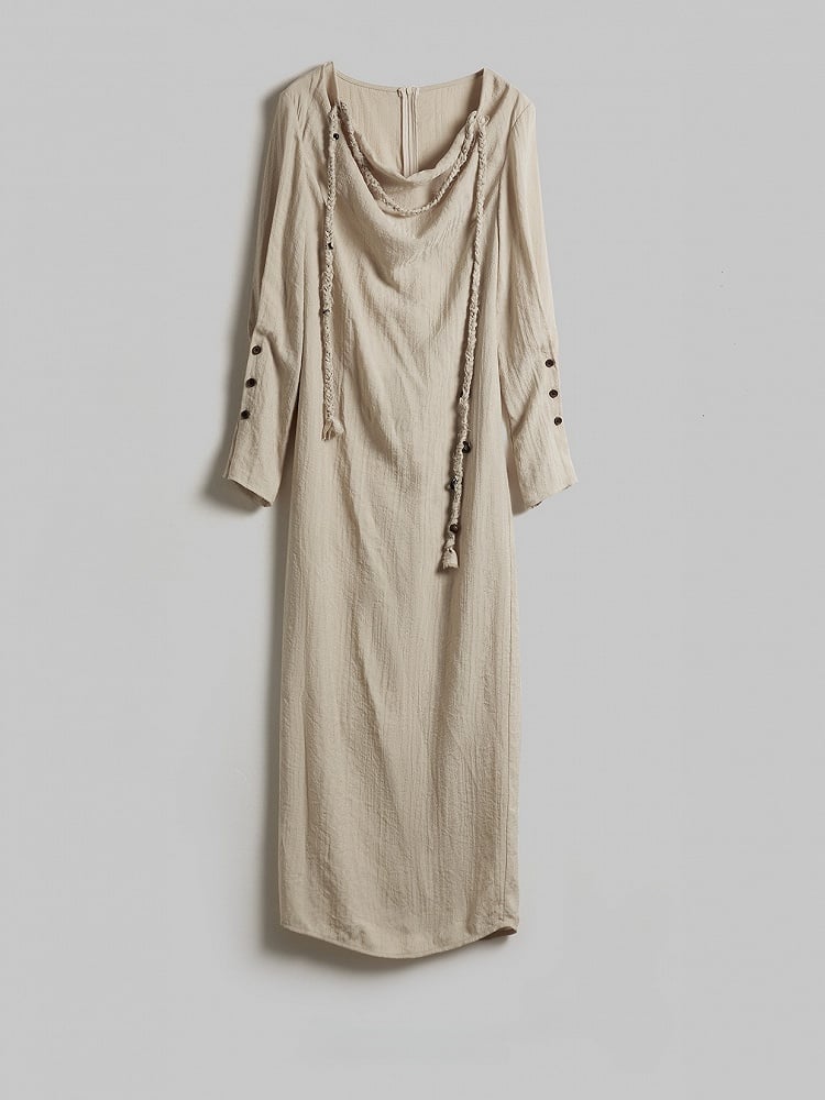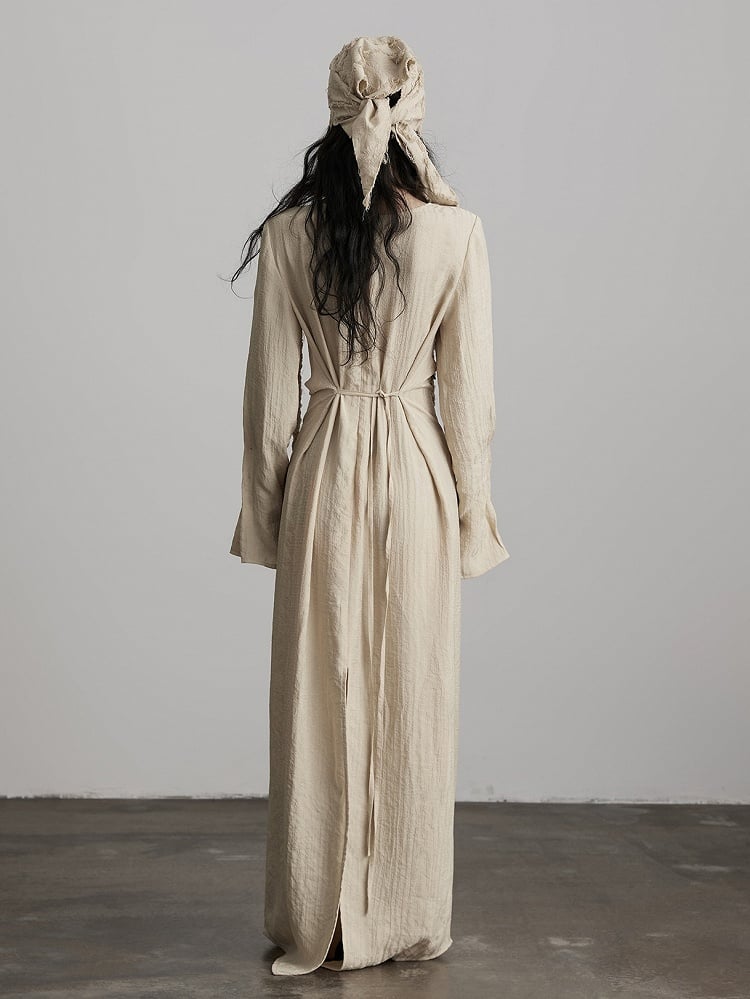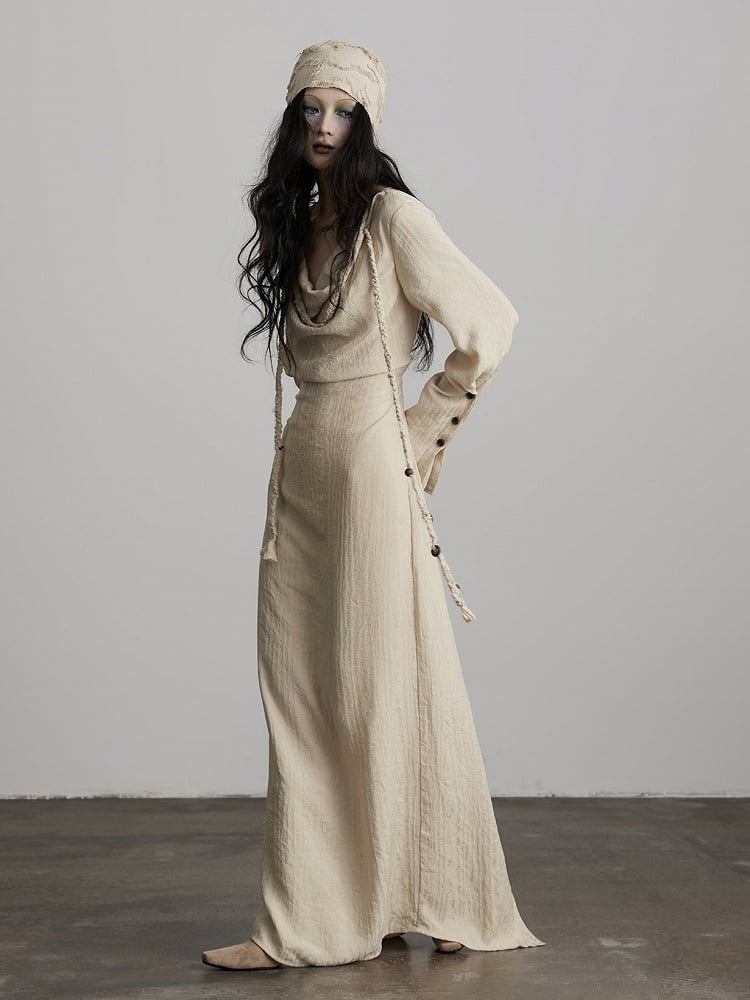 This dress highlights light apricot textured fabric + irregular cowl neck + hem slit: The light apricot hue fits the cool, relaxed vibe of dark style, the irregular cowl neck defines a casual, lazy shoulder and neck line, and the long-sleeve loose silhouette balances comfort and atmosphere; The back drawstring waist allows flexible silhouette adjustment, while the hem slit adds layers and improves mobility—it’s a signature light goth piece of "soft elements + dark relaxed design".