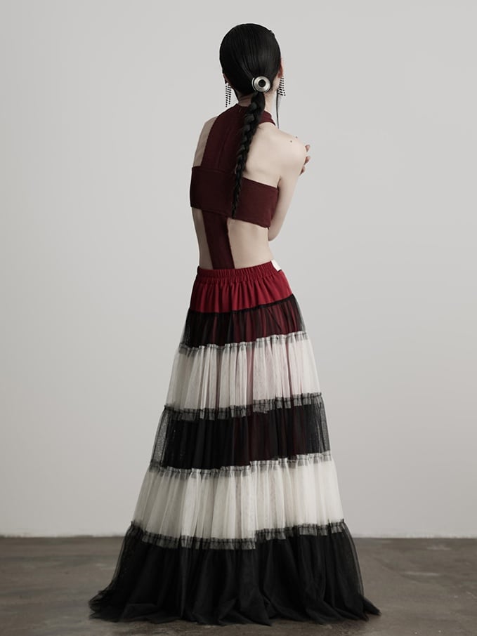 This Urban Goth umbrella skirt highlights red-black-white layered tulle + tulle fabric: Layered panels of black, white and dark red tulle align with gothic dark tones and retro tension; Lightweight tulle creates a voluminous umbrella silhouette, while fine ruffles between layers enhance softness; The maxi length balances atmosphere and styling—making it a signature light goth piece of "color layers + dark tulle texture".