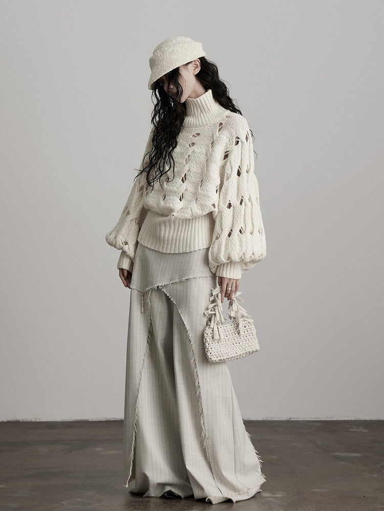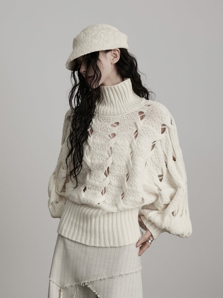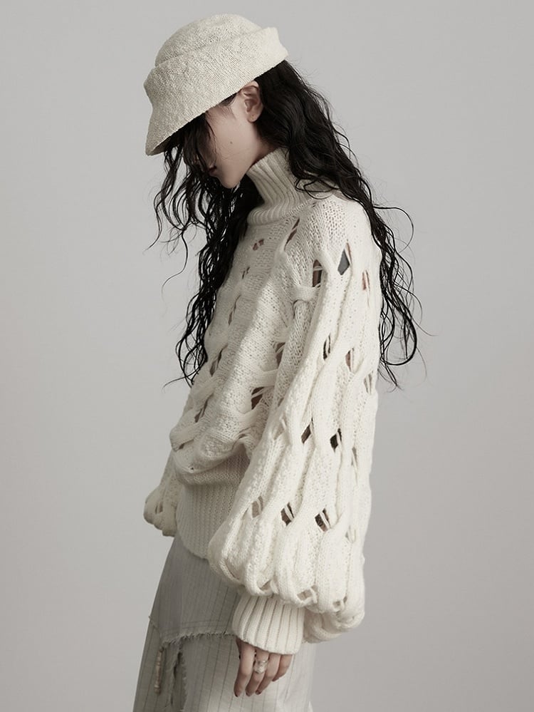 This Urban Goth knit sweater features white base + cutout design + cable-knit texture as core highlights: the pure white tone softens the harshness of dark style, while the irregular cutout details amplify the decadent deconstructed vibe; the classic cable-knit texture paired with distressed cutouts retains the warm charm of knitwear, and the "distressed" design fits the style’s avant-garde character; the turtleneck + oversized silhouette balances lazy atmosphere and styling tension, making it a signature piece that blends "soft white base + dark deconstruction" in light gothic outfits.
