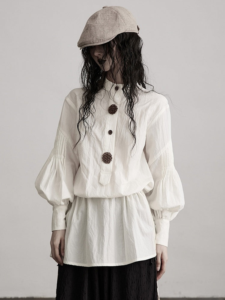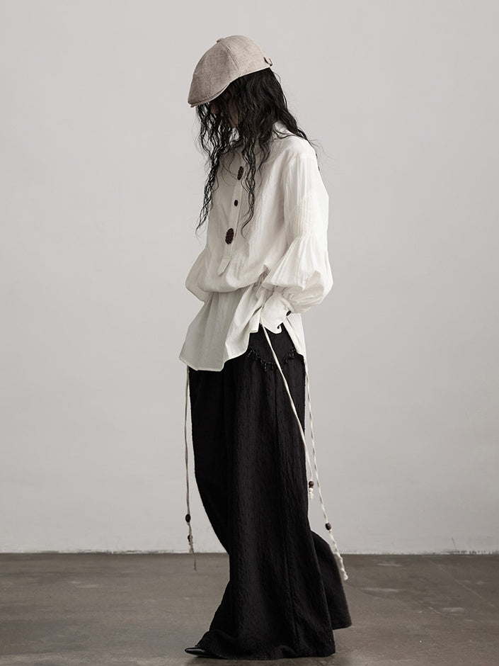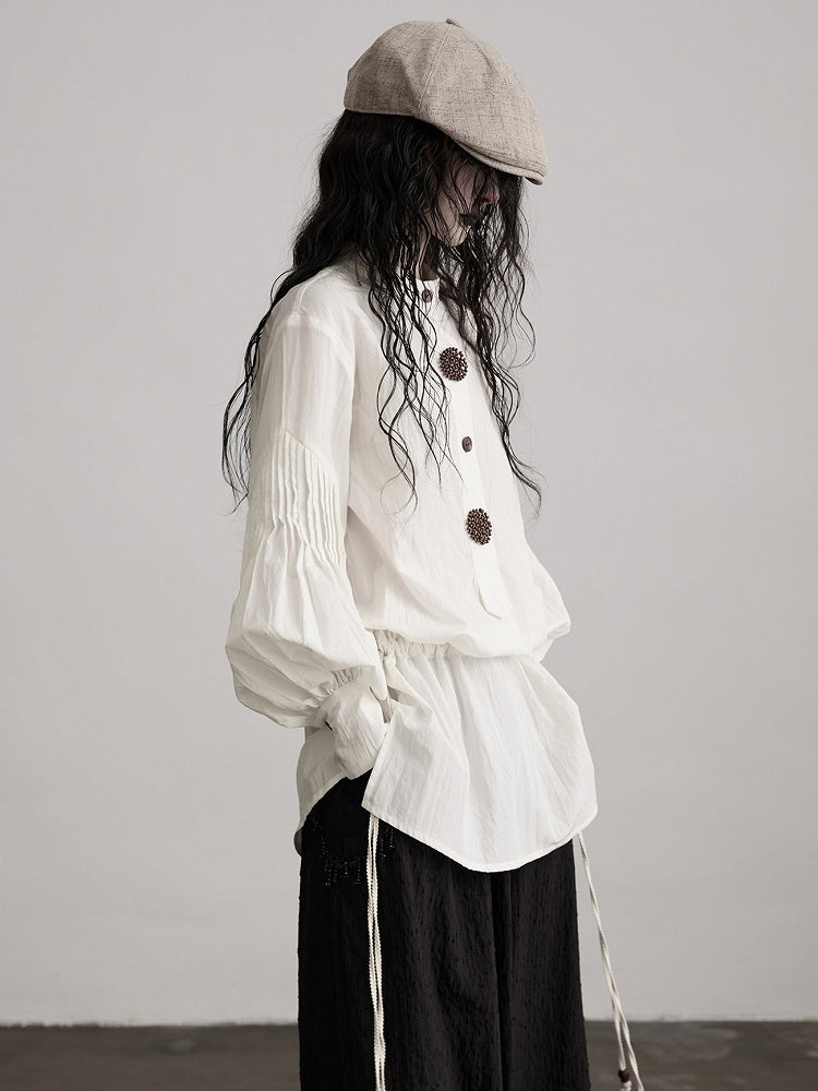 This Urban Goth-style white shirt is made of textured fabric to create a loose silhouette, with core designs including drawstring waist + puff sleeves: the drawstring can flexibly adjust the tightness of the garment, retaining casual drape while shaping the waistline; exaggerated puff sleeves combined with gathered cuffs enhance the retro avant-garde sense of the look, which fits the soft-cool tone of dark style. The decorative buttons add detailed texture, and the irregular hem further elevates the outfit layers.