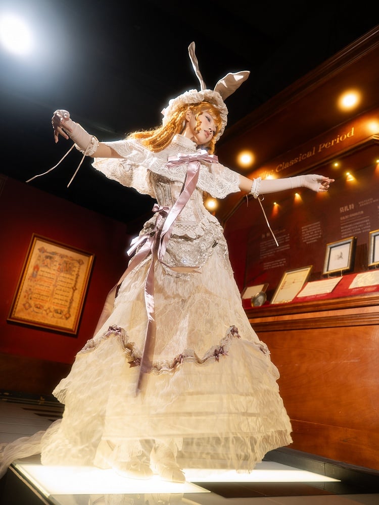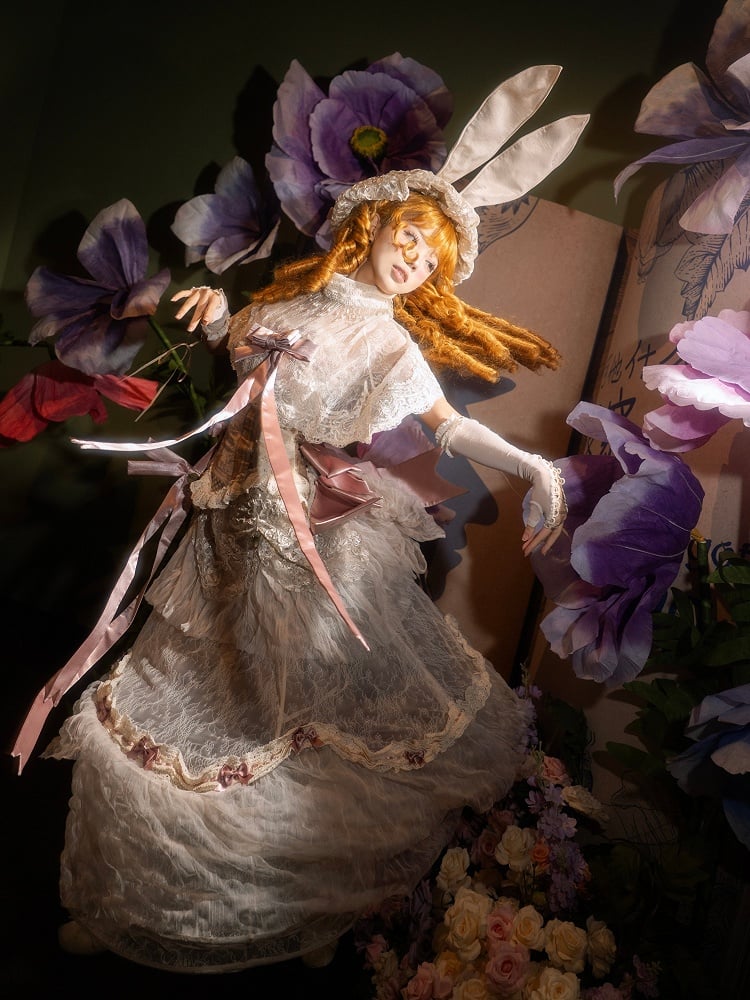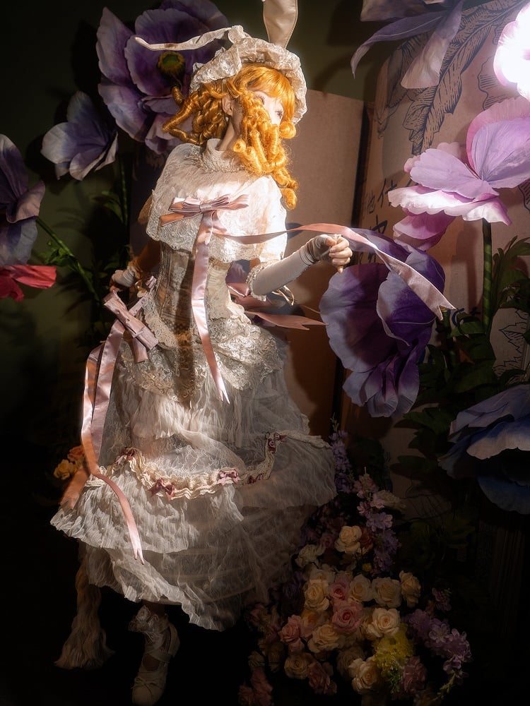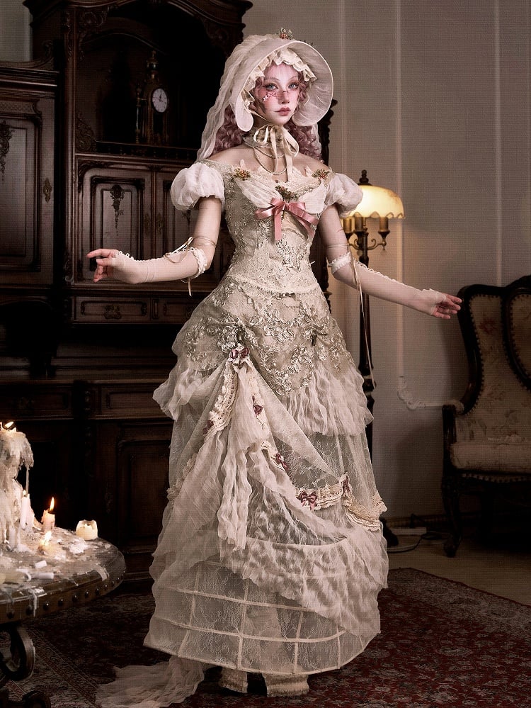 Expertly crafted with a combination of different fabrics, a discreet side zipper allows for easy wear, while the hem is adorned with layers of delicate lace and grey-pink bow embellishments, adding a touch of romantic sophistication.