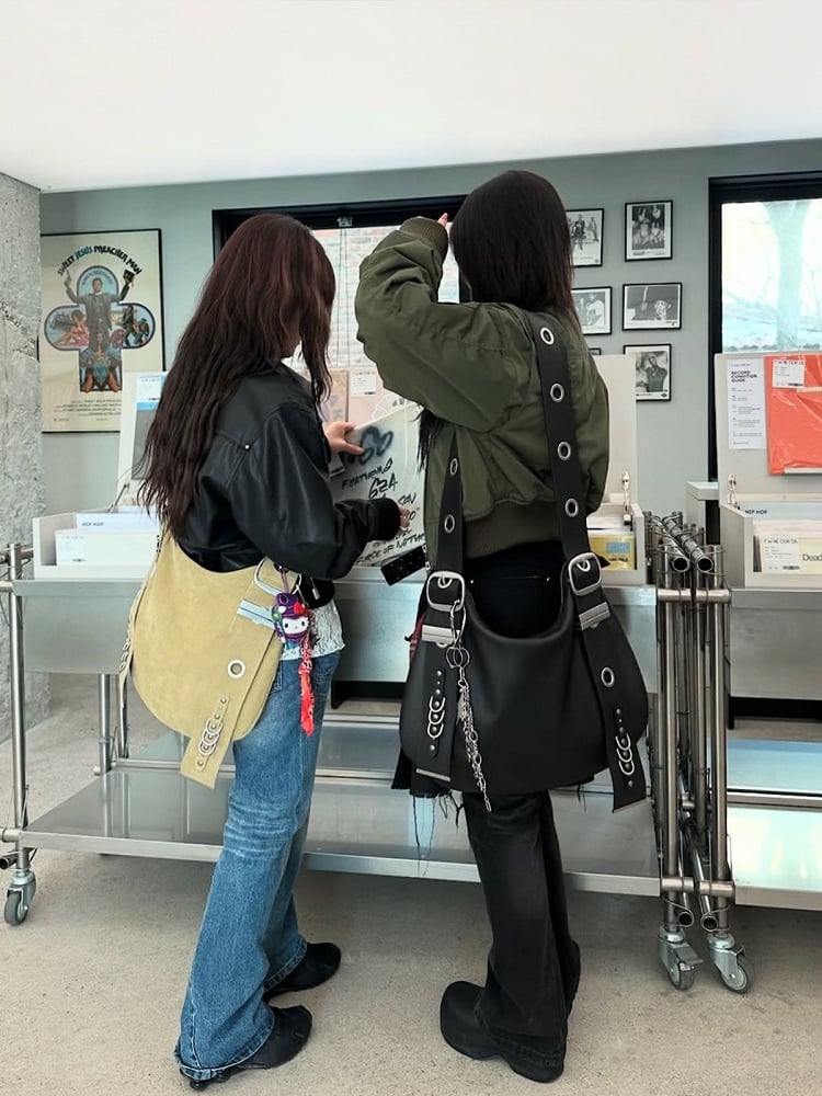 Rock our Vintage Crescent Moon Black Tote for edgy elegance. This punk-style bag features an adjustable strap (shoulder/crossbody wear), metal chains, and studs. Perfect for concerts or daily bold statements.