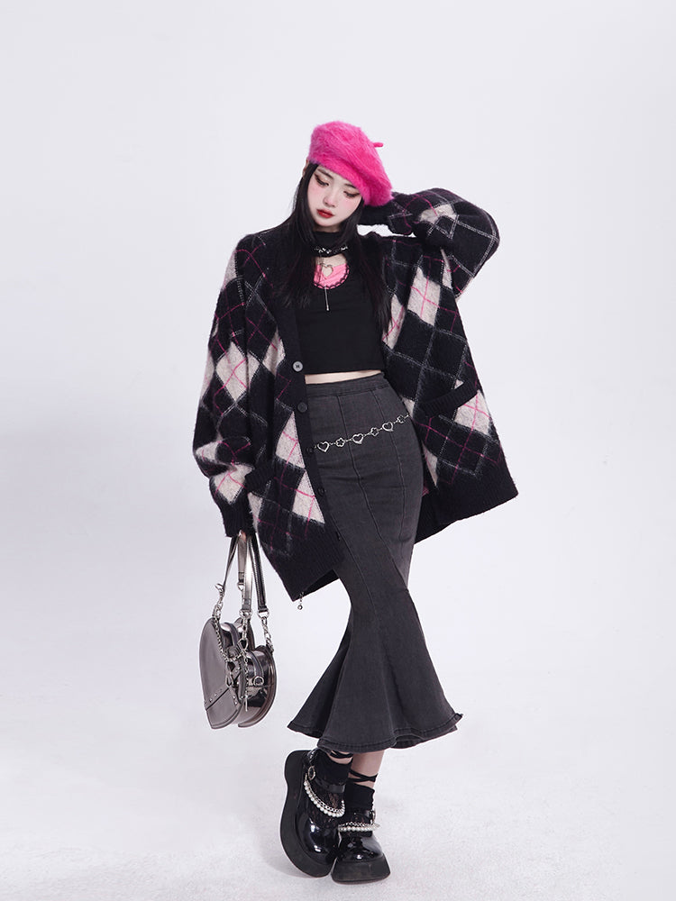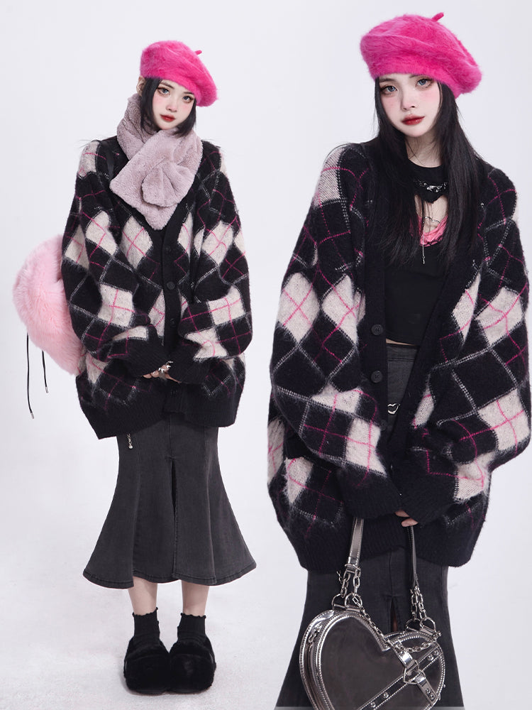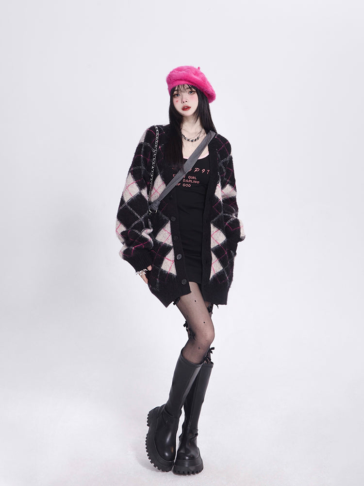 Cozy Elegance: Black V-Neck Long Sleeve Cardigan - Crafted from plush mink-like knit, this fall essential features a relaxed fit and stretchy, pill-resistant fabric. Its soft texture and vintage-inspired diamond pattern, complete with button closure, make it a flattering and timeless addition to any wardrobe.