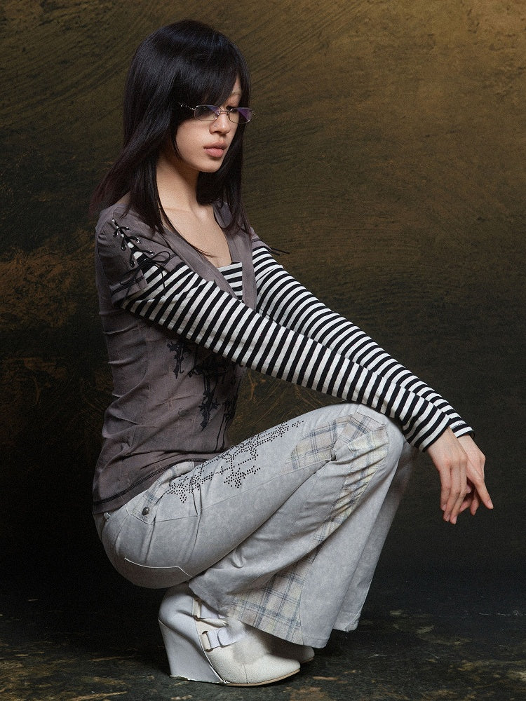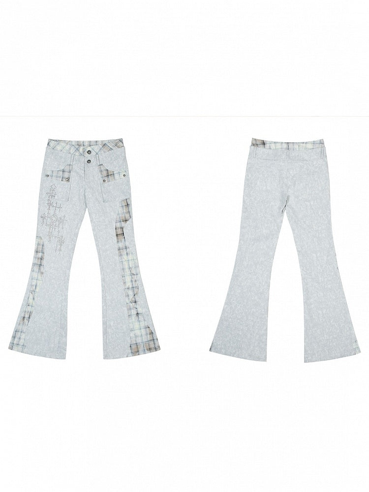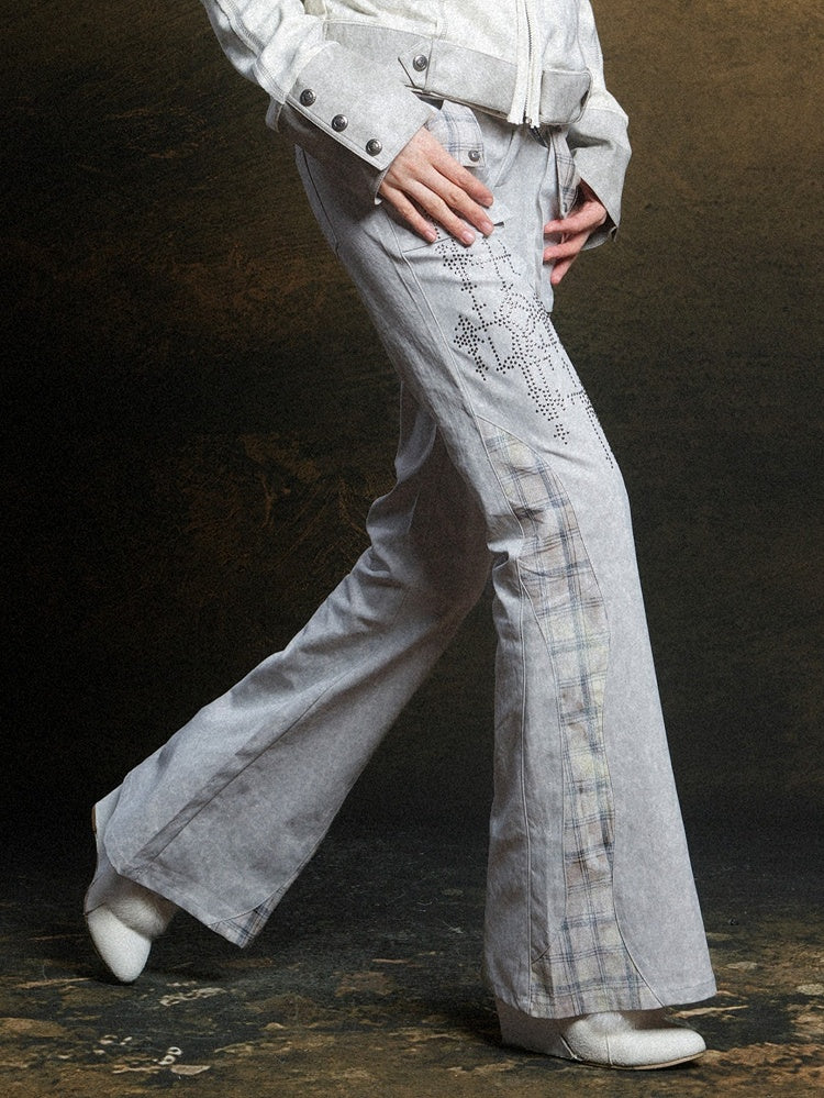 Elevate your style with these light gray double-waistband pants, featuring a layered plaid waistband that adds a unique twist. The right thigh is adorned with sparkling rhinestones, while contrasting plaid accents embellish the slant pockets and extend from below the pockets to the flared hem. These retro punk-inspired flared pants are a bold addition to any fashion-forward wardrobe.