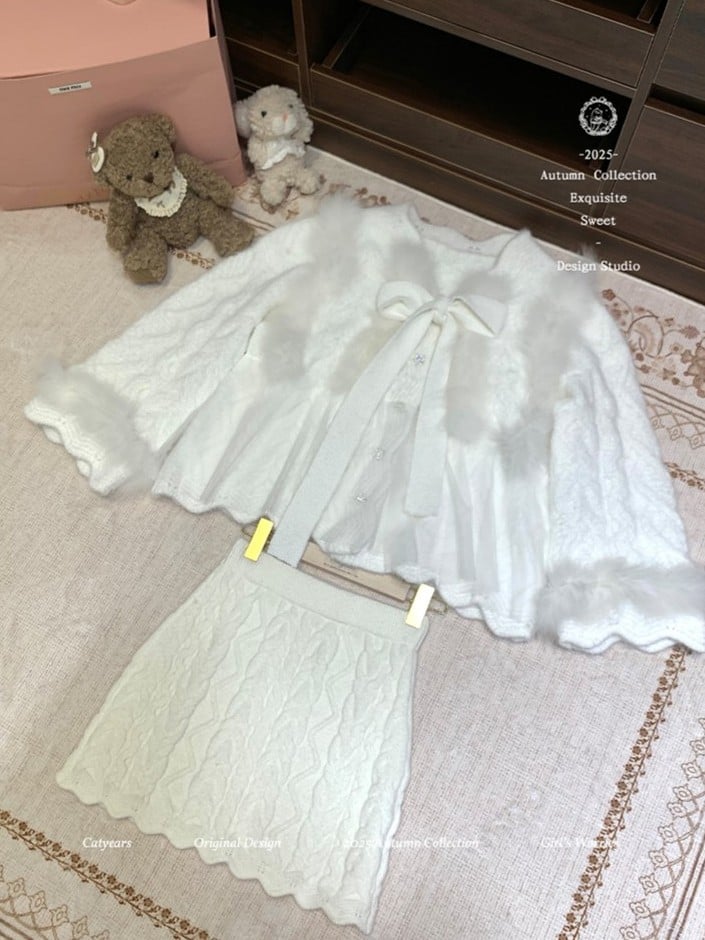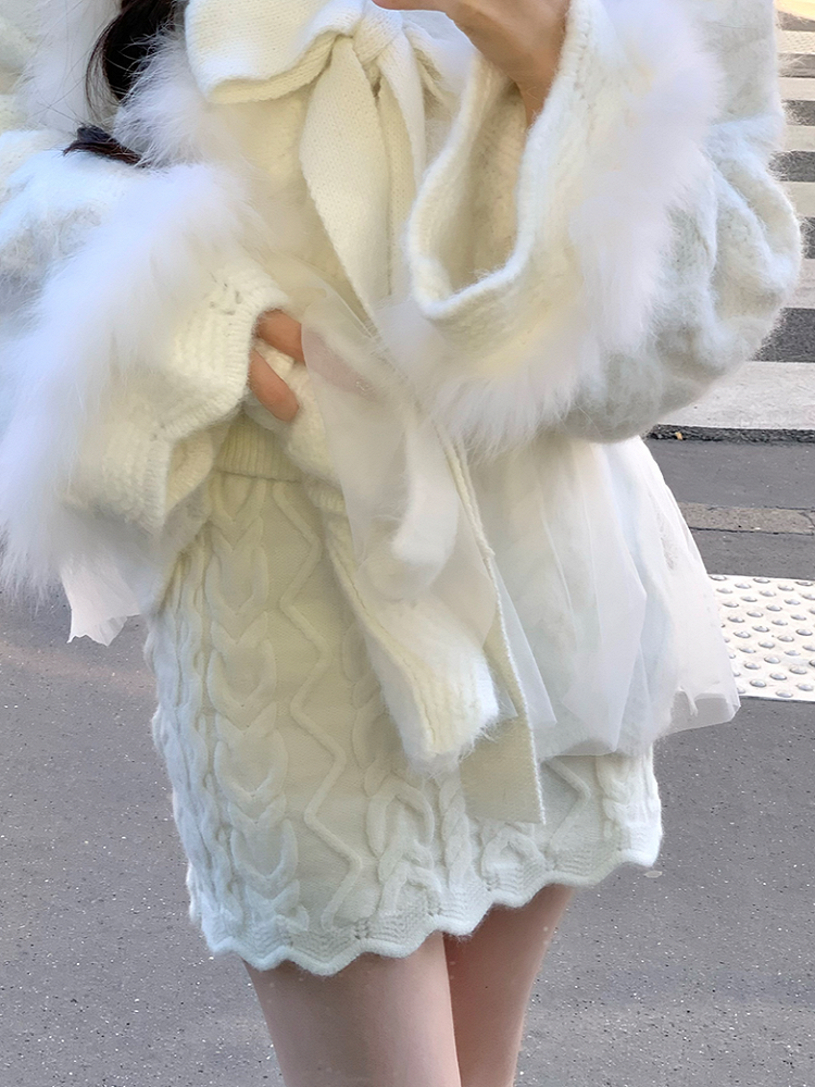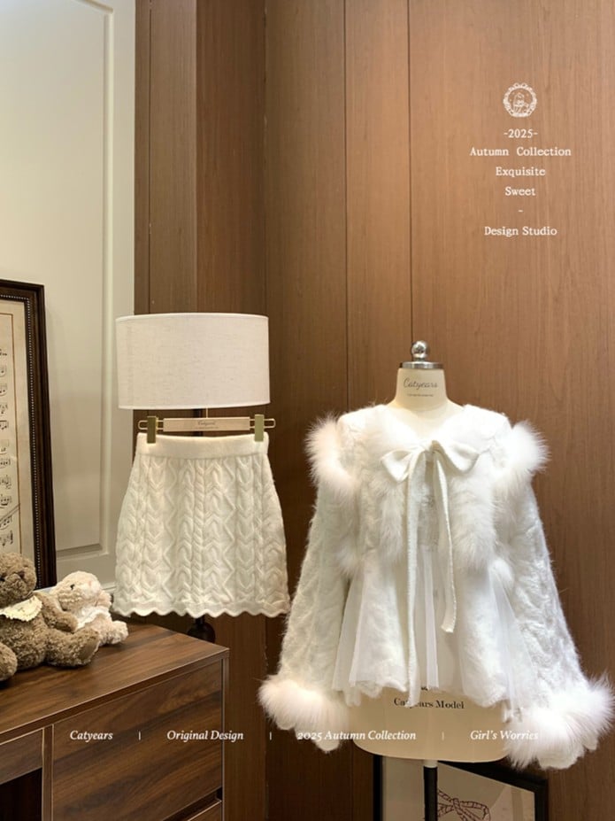 This vintage-inspired wool knit set features a dreamy, soft ivory knit top crafted from warm and cozy fabric. Delicate frayed trim along the neckline adds a subtle light-luxury touch and elevated elegance.