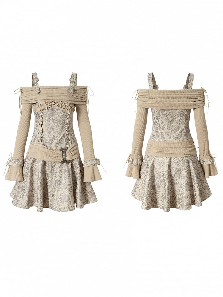 Vintage Punk Style Dress: This fitted A-line mini dress features a retro-patterned beige-gray PU fabric with a chic suspender design. The khaki knit off-shoulder top comes with lace-up details, complemented by a khaki knit waist belt with metal buckles. The bell sleeves are crafted from khaki knit and PU fabric Patchwork with lace-up accents, adding a unique touch to this long-sleeve ensemble.