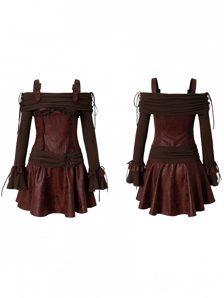 Vintage Punk Style Dress: This fitted A-line mini dress features a retro-patterned red PU fabric. The brown knit off-shoulder top comes with tie details, complemented by a brown knit waist belt with metal buckles. The bell sleeves are crafted from brown knit and PU fabric Patchwork with lace-up accents, adding a unique touch to this long-sleeve ensemble.
