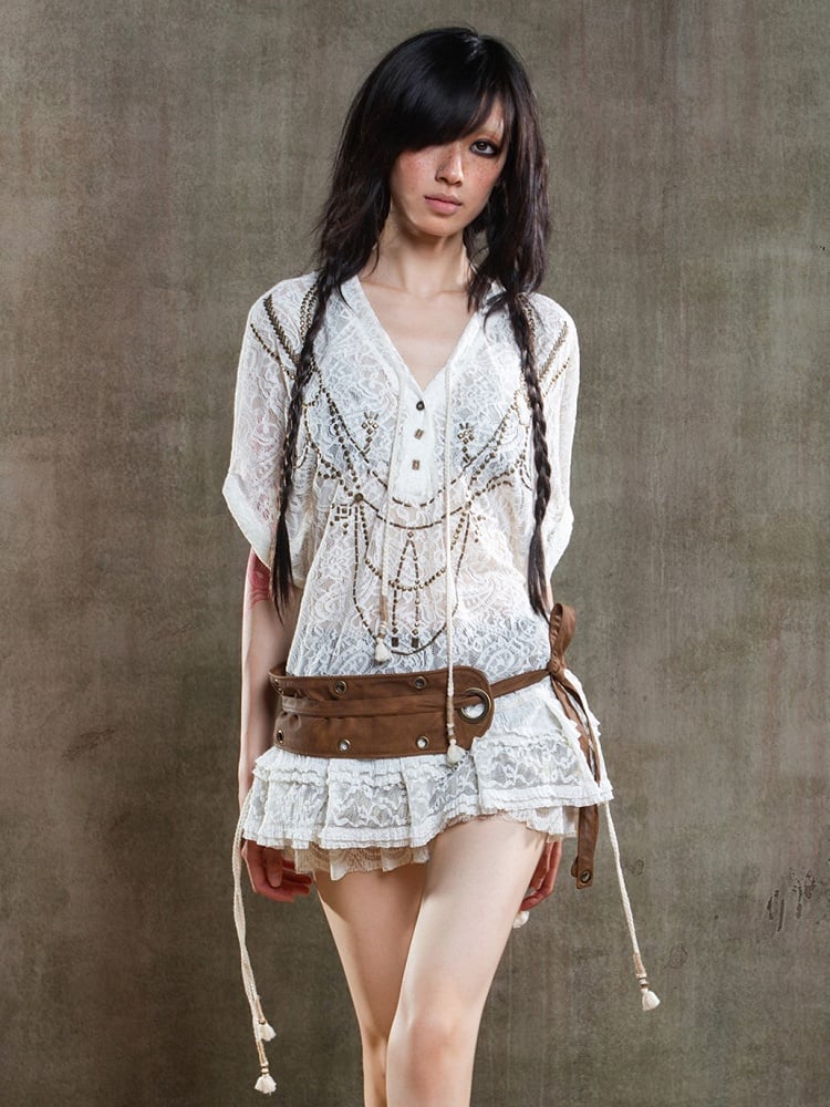Brown PU belt adorned with metal eyelets and long straps for tying; a perfect blend of punk, vintage, and romance.