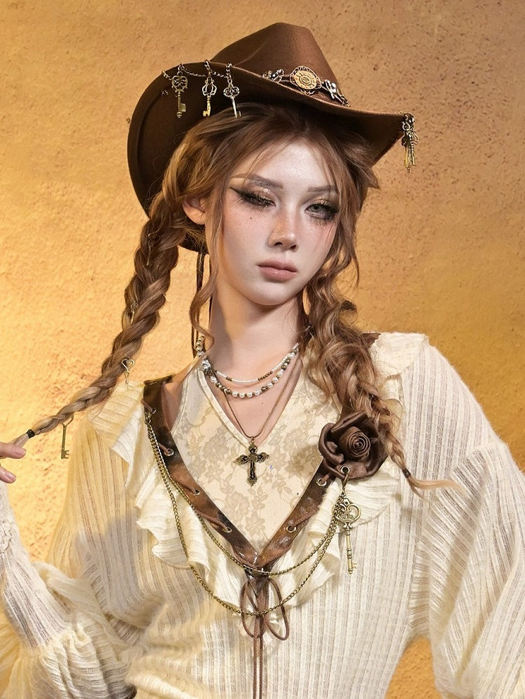 Vintage Punk Dark Brown Rose Brooch with Hanging Antique Gold Key and Double Metal Chains.