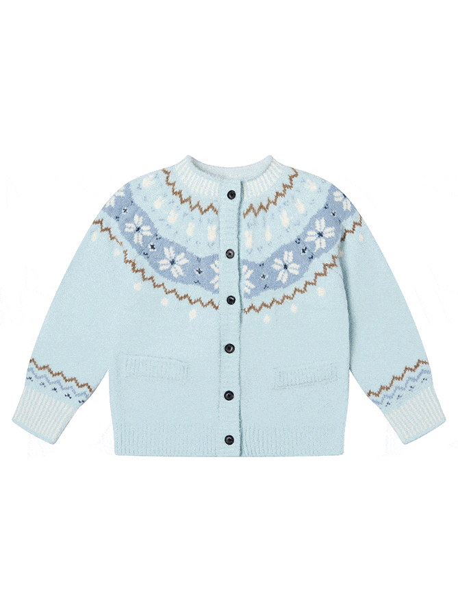 This light blue cardigan combines an elastic wool-mohair blend with a heavyweight three-needle knit for structured softness. Its vintage snowflake and Fair Isle patterns are rendered in a complexion-brightening retro palette. While natural pilling may occur over time, the piece remains a timeless fusion of textural warmth and refined craftsmanship.