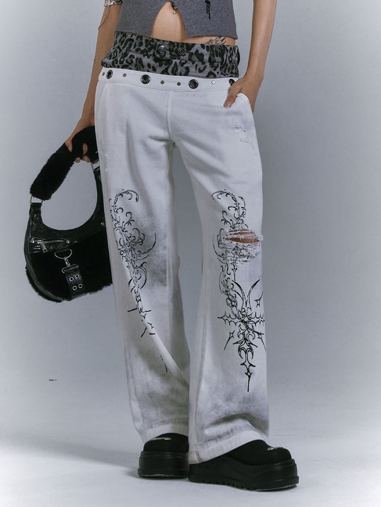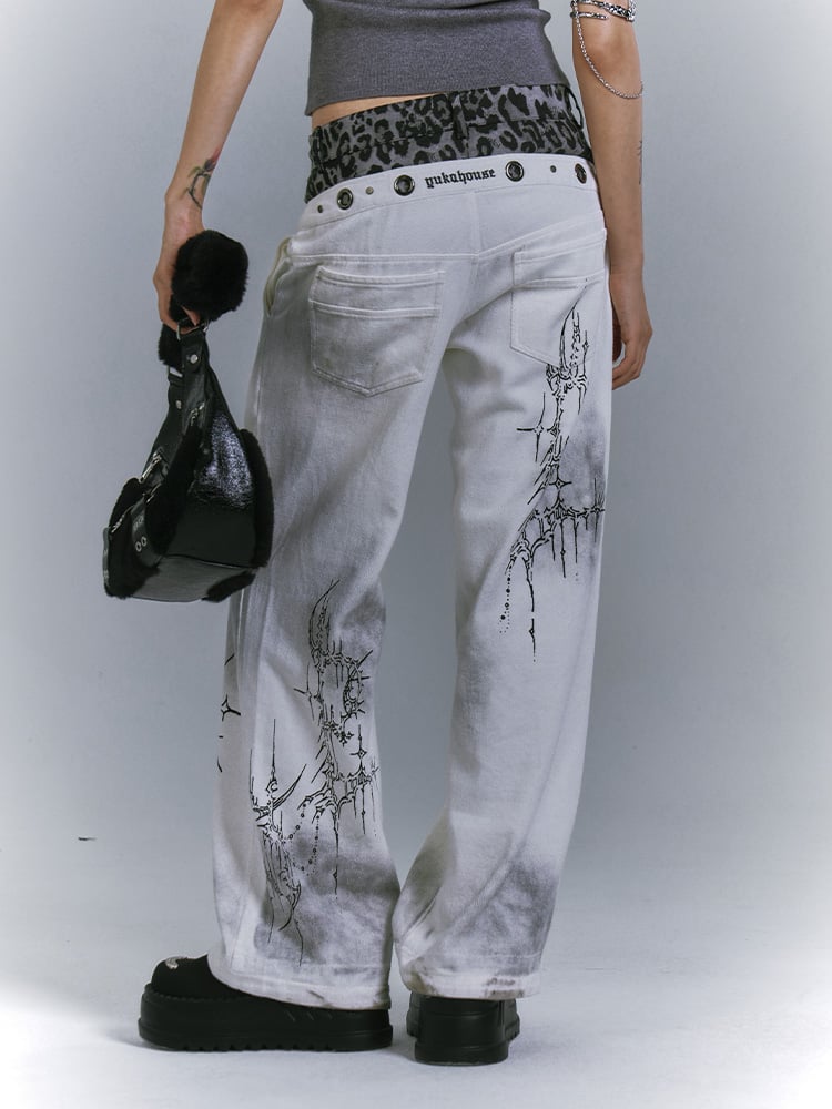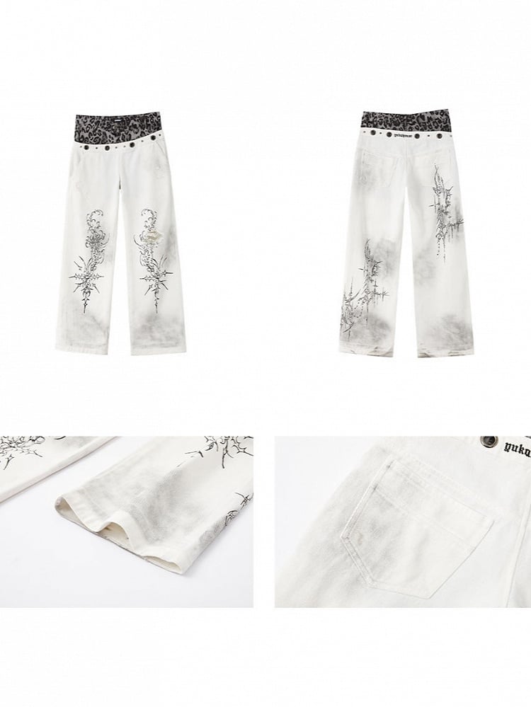 Vintage White Graffiti Jeans: Features a leopard print waistband, metallic eyelets, distressed knee rip, and black botanical print. Unisex high street style, perfect for early fall.
