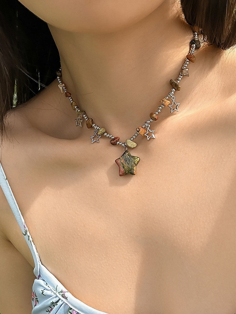 This necklace features a sandstone gravel star charm as a decoration, and there are many sandstones and gravel around the necklace, and some ordinary star charms in the middle of some gravel.