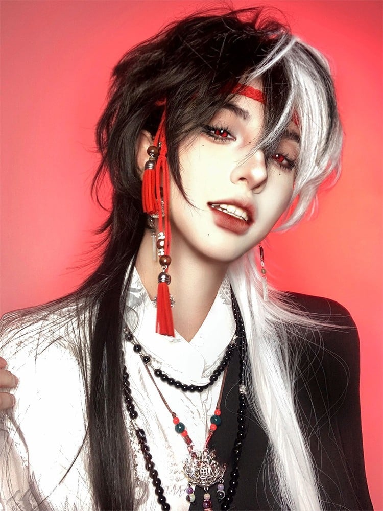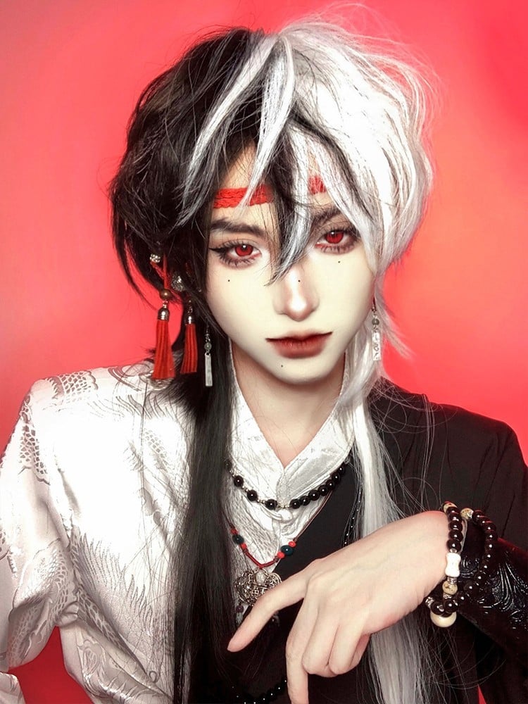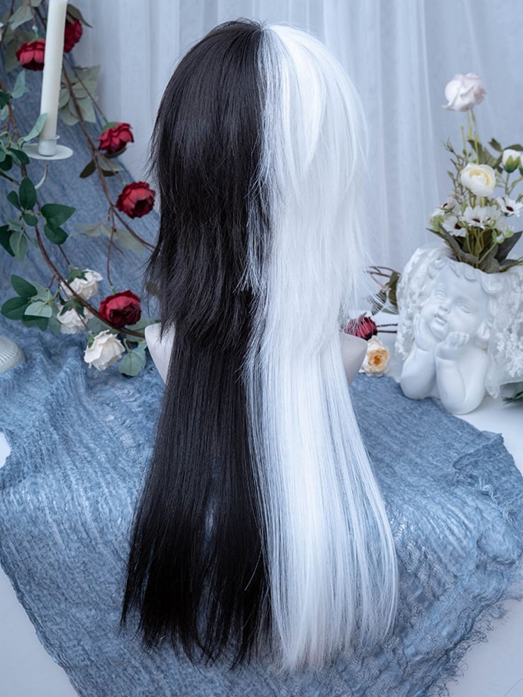 Complete your Ouji style look with this stunning white and black long wig. This wig features a classic color combination of white and black, adding a touch of elegance to your outfit. Perfect for Lolita fashion enthusiasts, this wig is designed to complement various outfits and styles.