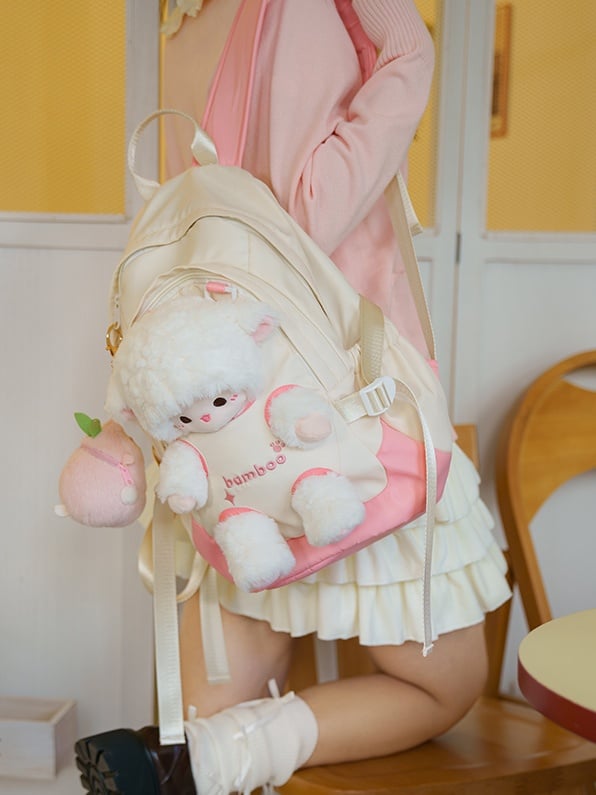 Embrace the charm of kawaii fashion with this adorable pastel white and pink backpack, perfect for adding a touch of sweetness to any outfit. Crafted from high-quality materials, this backpack features a spacious main compartment and multiple pockets to keep your essentials organized. The highlight of this bag is the cute, detachable lamb doll that adds an extra layer of playfulness.