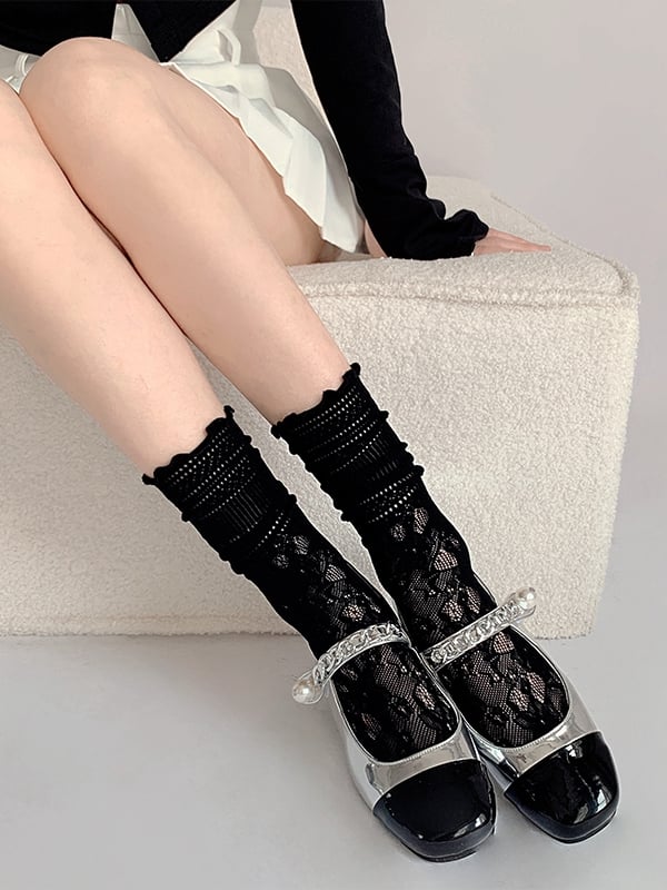 Elevate your outfit with these charming floral pattern lace socks. Available in classic black or white, these delicate socks add a touch of elegance to any look. The intricate floral design makes these socks a perfect choice for adding a hint of femininity to your ensemble.