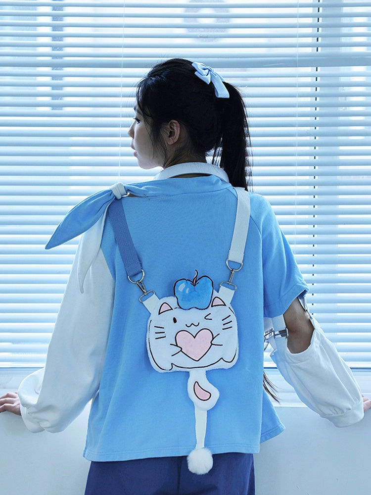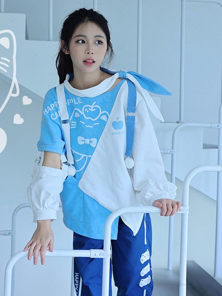 Embrace a unique blend of style and comfort with our Asymmetrical Color-Blocked Hoodless Sweatshirt. This eye-catching piece showcases asymmetrical color-blocked panels, creating a dynamic and modern look. The semi-closed scarf design at the neckline adds a touch of sophistication, while the adorable kitty and apple prints on the front bring a playful element to your outfit. The irregular hemline enhances its trendy appeal, and the sleeves feature intricate hollow-out designs with strap buckles, adding an extra layer of detail and charm. Perfect for those who love to stand out, this sweatshirt is a must-have addition to your wardrobe.