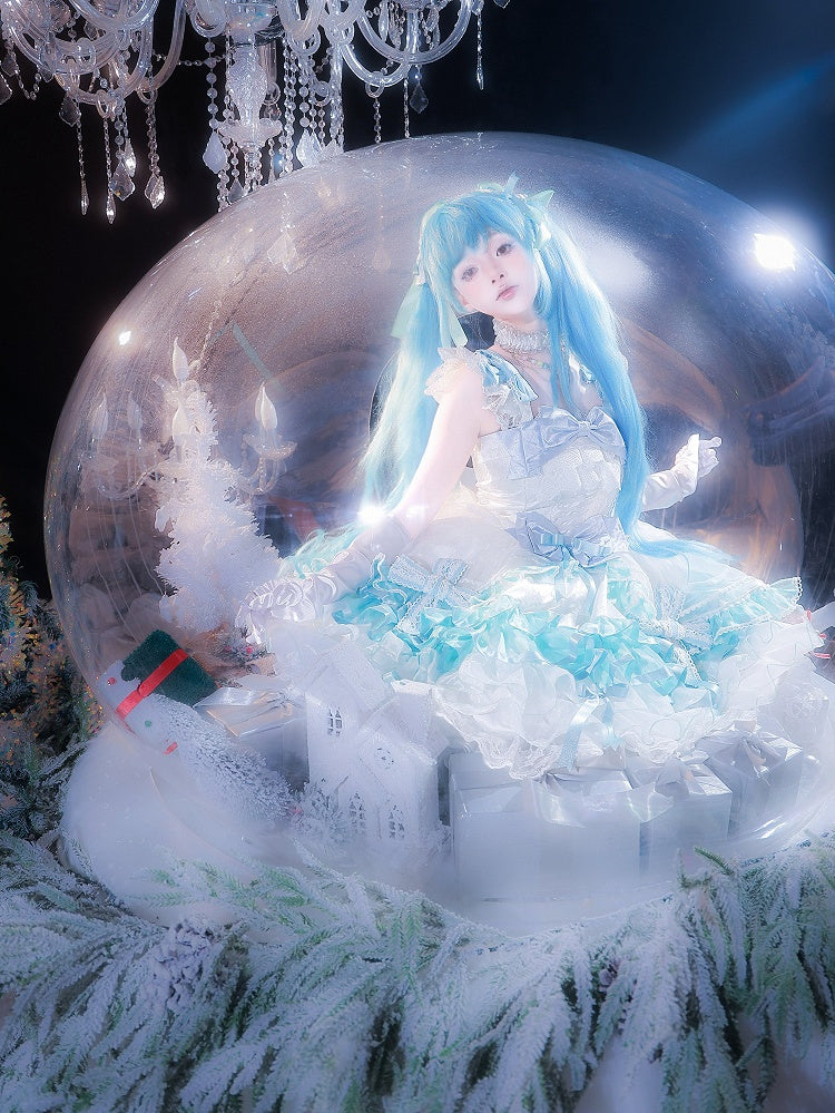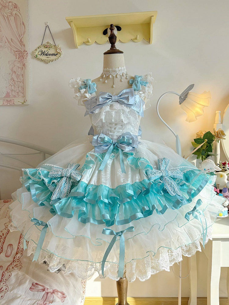 This charming JSK (Jumper Skirt) dress, features intricate lace detailing and a large, eye-catching bow at the center, adding a touch of sweetness and elegance. The back of the dress is designed with both elastic and lace-up elements, ensuring a comfortable and customizable fit for various body types. The skirt flares out into multiple layers of ruffled tulle, each adorned with dainty bows, creating a voluminous and whimsical silhouette.