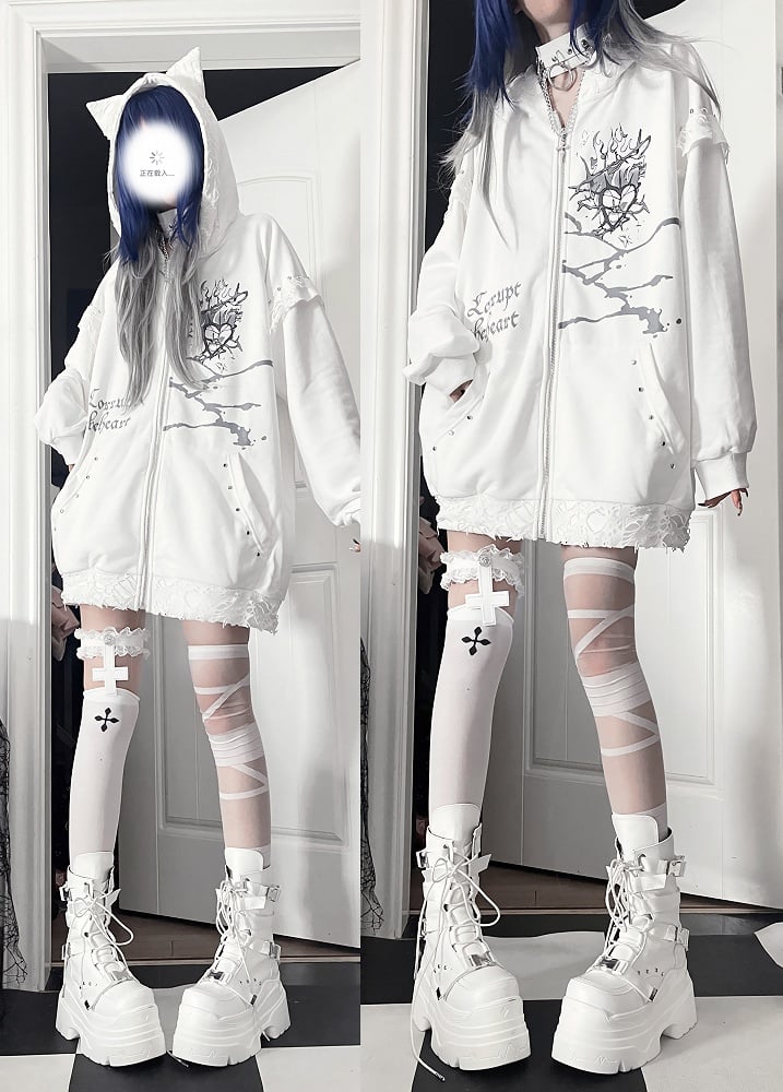 Unleash your edgy charm with this White Guro Kawaii Zip-up hoodie, a perfect fusion of cute and punk aesthetics. The design features bold heart and letter prints that capture attention, while the studded embellishments add a rebellious twist. This jacket is ideal for those who love to stand out and express their unique style. Whether you're heading to a casual outing or a themed event, this piece will ensure you make a statement. Embrace the playful yet fierce vibe of Guro Kawaii fashion with this standout jacket.