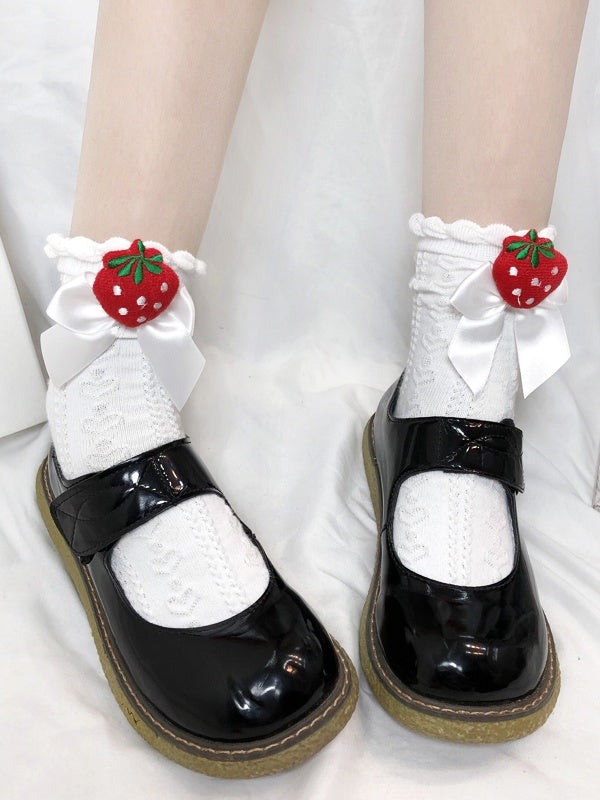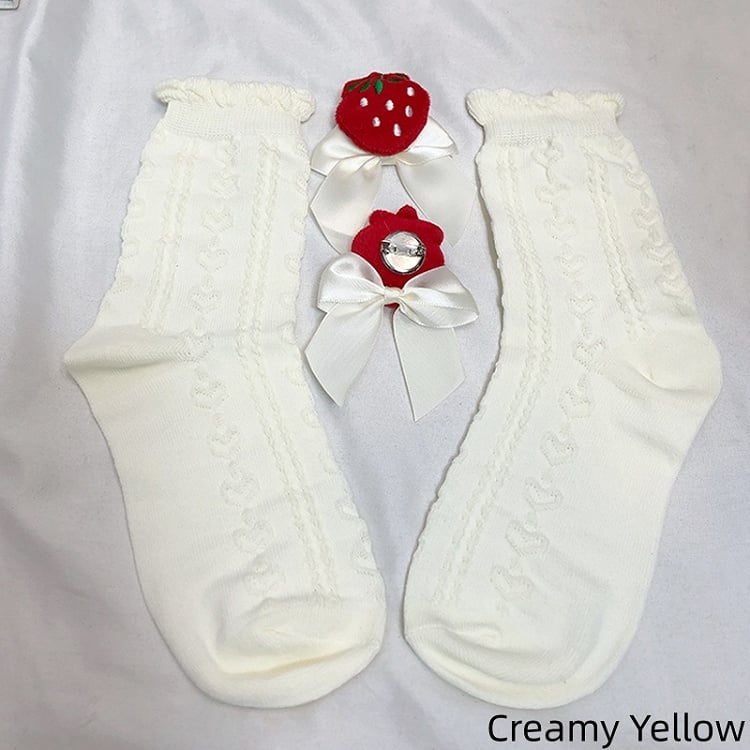 These cotton socks are available in White, Creamy Yellow and Black, featuring detachable strawberry bowknots and ruffled edges. Suitable for sweet Lolita, daily cute outfits and other styles.