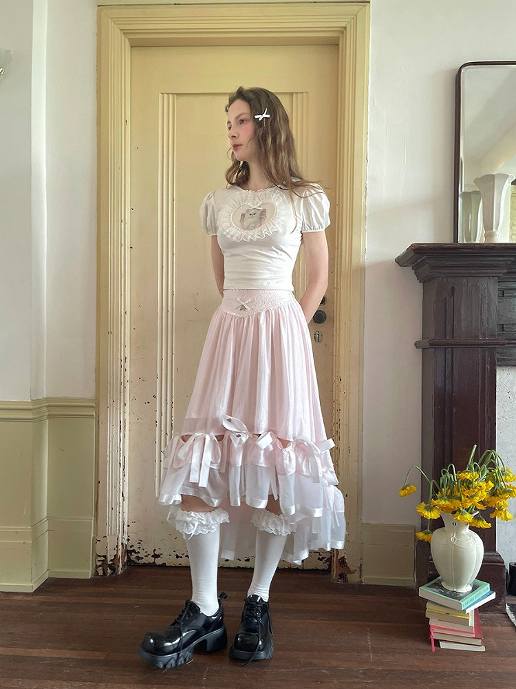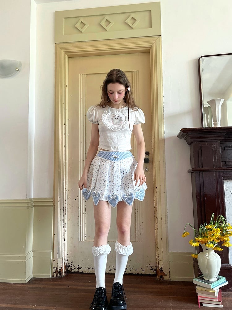 This white cropped tee combines playful puff sleeves with a sweetheart applique featuring an adorable cat print. The back lace-up detail adds an adjustable fit and romantic touch. Perfect for pairing with high-waisted bottoms, it effortlessly blends kawaii charm with modern chic for a stylish everyday look.